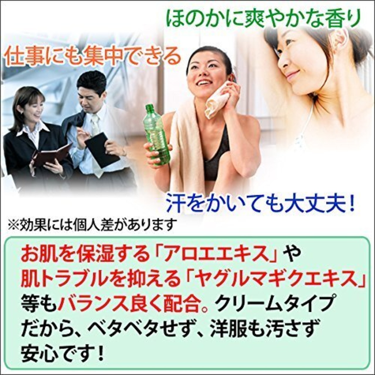 満員電車やエレベーター等の密室で自分のニ オイが気になる…つり革を持ったり、お座敷に 上がる時に隣の人の反応を気にしてしまう… など季節を問わず「ニオイ」の悩みはつきま せん。 あのイヤなニオイの元は、アポクリン汗腺という特殊な汗腺から分泌される、ニオイの強い汗 に対して、 雑菌である「バクテリア」が繁殖し、 悪臭となって周囲にばらまかれるからなんです。 気になるワキや足等に塗れば、ワキの汗や足 の細菌から出る悪臭に働きかける事が期待 できます! さらに、お肌を保湿する「アロエエキス」や肌トラブルを抑える「ヤグルマギクエキス」等もバ ランス良く配合。クリームタイプだから、ベタベタせず、洋服も汚さず安心です! シャワーを浴びても、汗をかいても大丈夫。 1年中気になるニオイ対策は、大人のエチケットです。