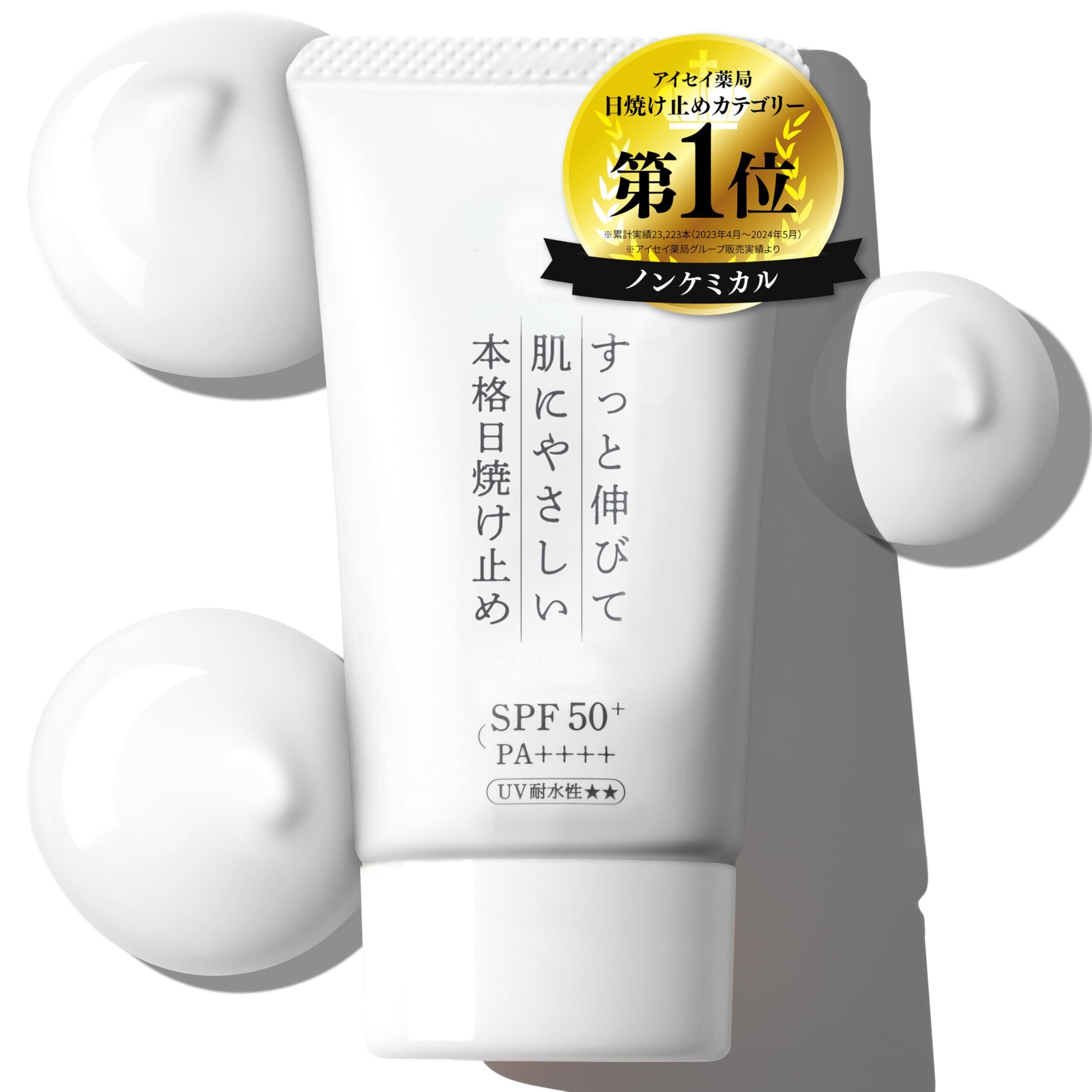 ✨肌にやさしいノンケミカル処方:高カット処方なのにノンケミカル処方で、肌にやさしく年齢とともに敏感になりがちな肌におすすめな本格日焼け止めです。 ✨頼れるウォータープルーフ:ベタつきにくく、さらっとした使用感で汗をかいても崩れにくいのが特徴です。夏場の発汗や海・プールでも安心してお使いいただけます。