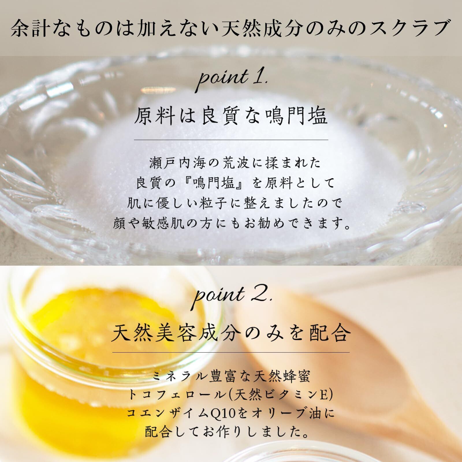 【敏感肌にも優しい天然塩のマッサージソルト】国産の良質な「鳴門塩」と天然美容成分のみで作られた手作りのソルトスクラブです。肌に優しい粒子に整えましたので、敏感肌の方でも安心してお使いいただけます。