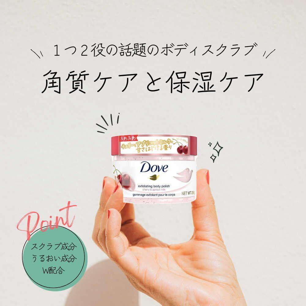 まるでホイップクリームのようなテクスチャー。 スクラブ成分配合で、摩擦を抑えながら、 くすみの原因となる古い角質を やさしく落とすことができます。 うるおいのダヴならではの高保湿ミルク配合で、 うるおい成分が肌の深層まで浸透。 角質を落としたデリケートなお肌を保湿ケアします。 洗い上がりは、しっとりとなめらかな肌ざわりに。 うるおってしっとりとした透明肌に導きます。 古い角質の蓄積によるもの ひじやかかとなど カサつきが気になる部分を中心に、 顔以外の全身にご使用いただけます。チェリー&アプリコットミルクの甘さはじける香りに包まれる、 癒しのバスタイムを。