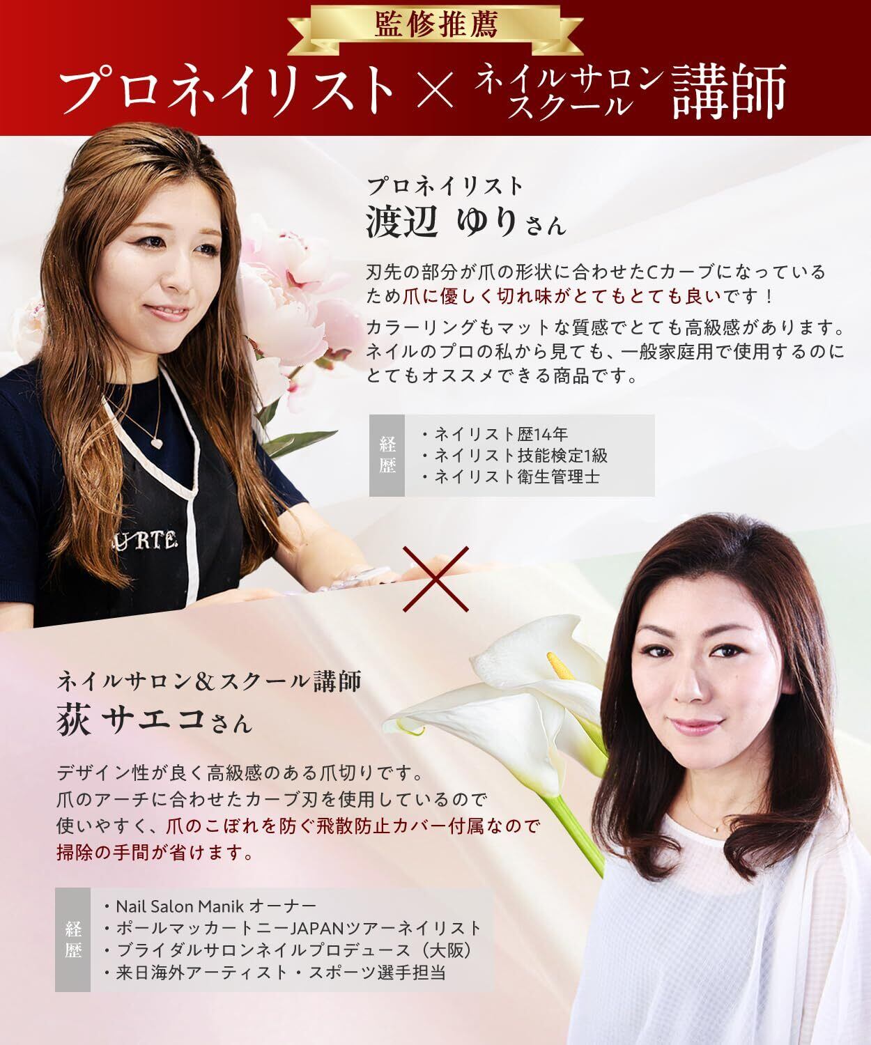 【カーブ刃でスパッと快適カット】koruhaの爪切りは、爪の形状に合わせた「カーブ刃」を採用。刃の角度や幅をミリ単位で調整し、切れ味の良さを追求しました。軽い力でスパッと切れるので、厚い爪や硬い爪もスムーズに整えられます。【プロネイリスト×ネイルサロン&スクール講師監修推薦】プロネイリストの渡辺ゆりさんと、ネイルサロン&ネイルスクール講師の荻サエコさんに監修推薦していただいております。