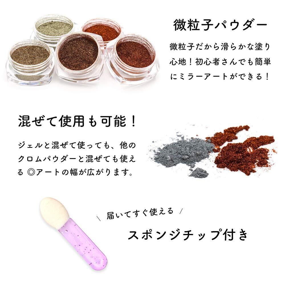 グリッター、ポリッシュでもないパウダーで創るメタリックアート。ニュアンスネイルにぴったり。ミラーのような輝きと艶やかさが手に入る。アイシングジェルを併用すれば流行りの凸凹ネイルが簡単にできます。微粒子パウダーなので簡単にミラーアートができます。カラージェルと混ぜて使ったり、他のクロムパウダーと混ぜても使えます。