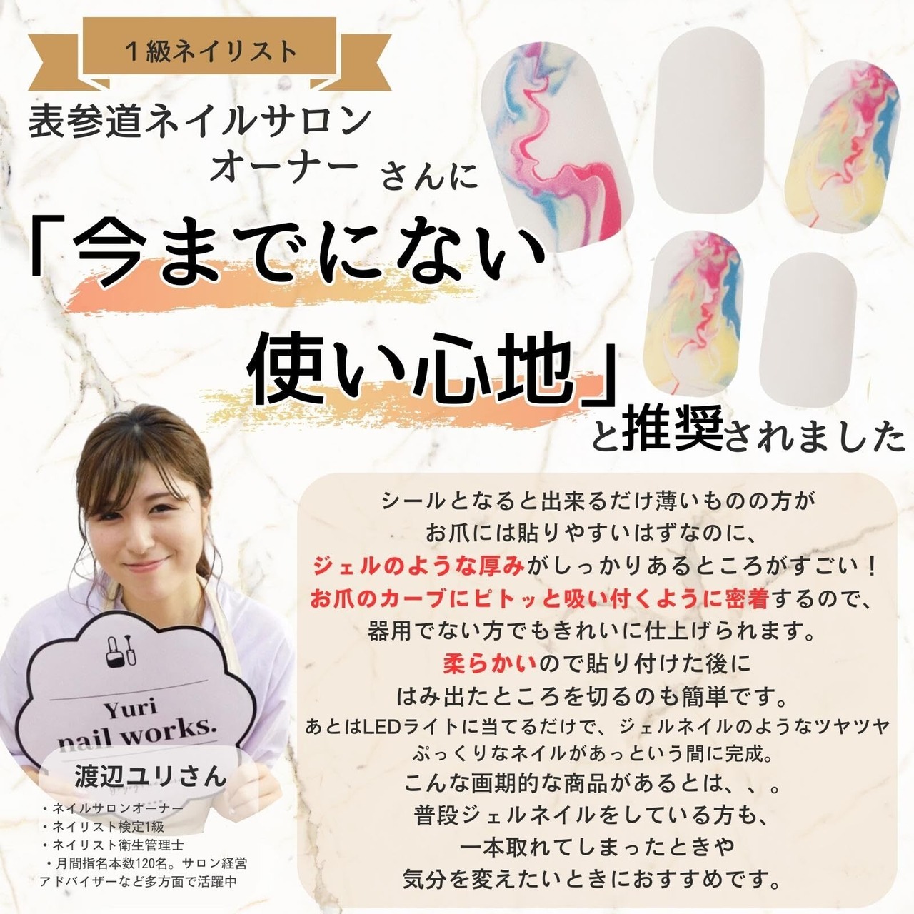 【時短・簡単・サロンクオリティー】 ①シールを選ぶ➁貼る➂LEDライトで硬化の簡単3ステップで完成。個人差はありますが、最大約2週間持続します。単色カラーやグラデーション、偏光カラー、蓄光で光るタイプなど幅広く取り揃えておりますので、つける人の個性をさりげなく引き出します。サロンに行く時間のない方や初心者の方も気軽にネイルをお楽しみいただけます。新デザイン順次追加予定です。