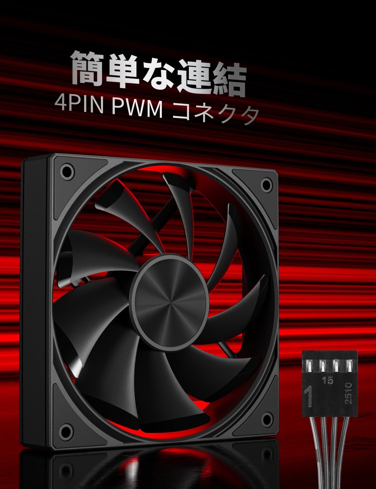 【PWM機能を搭載】PWMファンは、回転数を抑制し、発熱量に応じて自動的に回転速度を変化させる制御です。PCケースファン最適な冷却性能を発揮するために、CPU温度によってPWMファンが自動制御できます。600RPM低転数から最大1650RPM高転数までどの回転数も対応します。