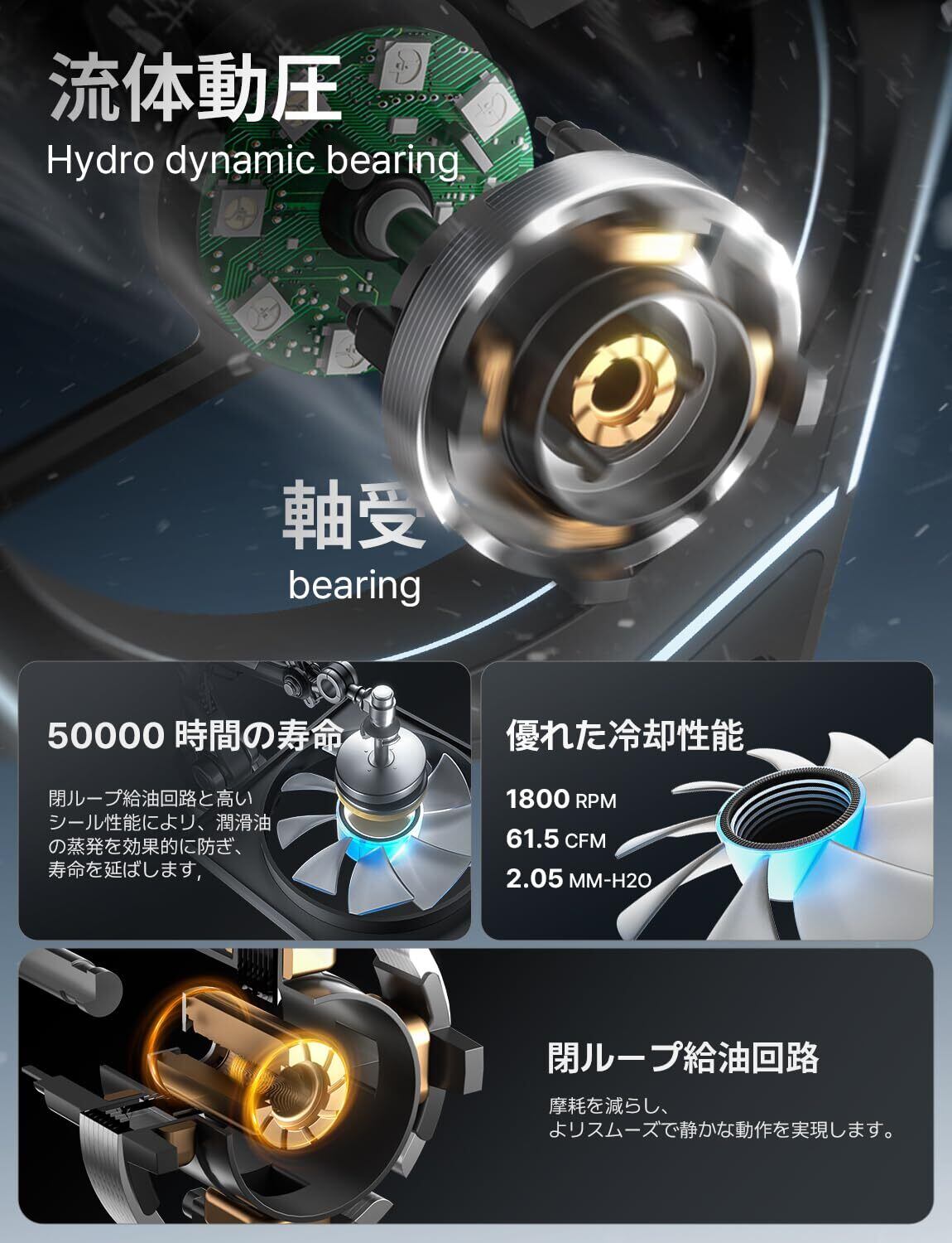 [仕様]: モデル:AMICI-5GT-White。数量:3本。サイズ:120*120*2.5。正向きファンブレード。回転数:650-1800 RPM/Min。ノイズ:6-30 dB(A)。風量:61.5 CFM 。風圧:2.0mmH2O。ベアリングのタイプ:ハイドロダイナミックベアリング。寿命:50000時間以上。240/360mmのCPU水冷高さに対応。