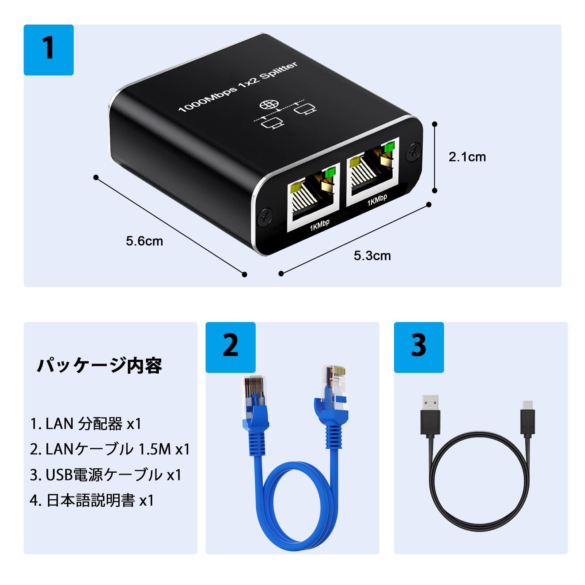 スイッチングハブ LAN ハブ 1入力2出力 LANケーブル付き(1.5m) LAN 分配器 RJ45 高速1000Mbps LANケーブル 分岐 LANケーブル分配器 2台同時使用 Cat5/Cat5e/Cat6/Cat7/Cat8対応 ネットワーク拡張 二股同時出力 有線LAN中継器 Switch/PS5/PS4に対応
