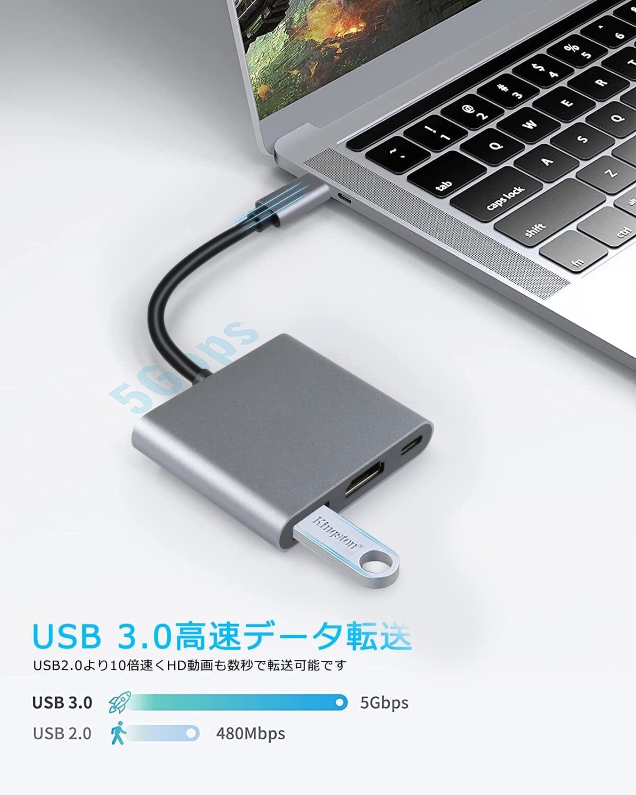 【USB 3.0高速データ転送】弊社のアダプタはUSB-A(USB3.0)ポートを搭載することで、最大データ転送速度は5Gbps。USBフラッシュメモリーだけでなく、ポータブルHDDやSSDでもスピーディーにデータの読み書きができます。音楽のプレイリストやフォトアルバムなどをスムーズに同期こともできます。下位互換があるので、有線のマウスやキーボードを挿して使うこともできます。