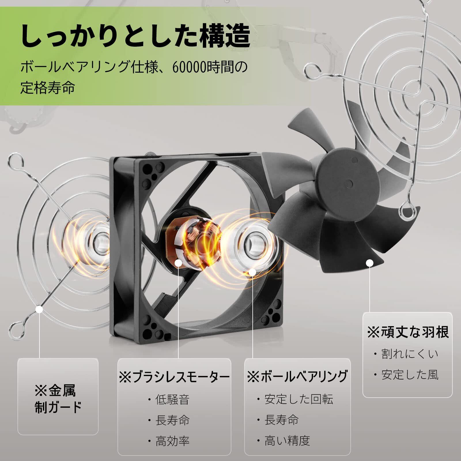 デュアルボールベアリングを採用しており、約60000時間の理論寿命を持ちます。稼働するにつれて、騒音の増加にならず、24時間連続稼働可能。