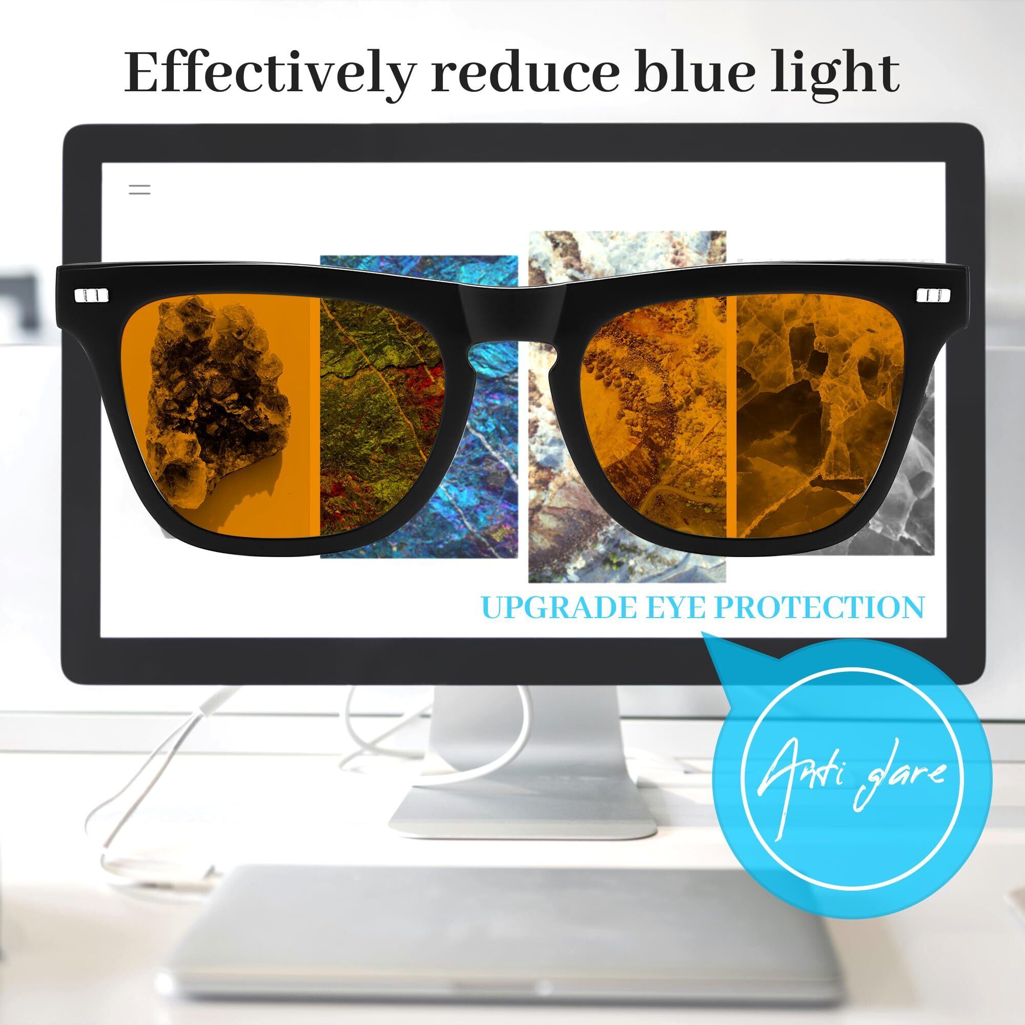 ブルーライトカット、紫外線対策、UV400保護:イエローレンズを採用され、ブルーライトを吸収し、視界をスムーズにすることで目の疲れを軽減し、長時間のコンピュータ作業やスマートフォンの使用時に役立ち、視覚的な快適さを提供します。さらに、イエローレンズはコントラストを向上させ、暗い場所でも視認性が改善されることがあります