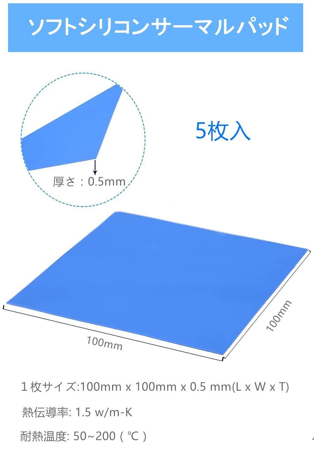 製品仕様:ソフトシリコンサーマルパッド5枚入、1枚サイズ:100mm x 100mm x 0.5 mm(L x W x T)、熱伝導率: 1.5 w/m-K、 耐熱温度: 50~200(℃)、カラー: ブルー。