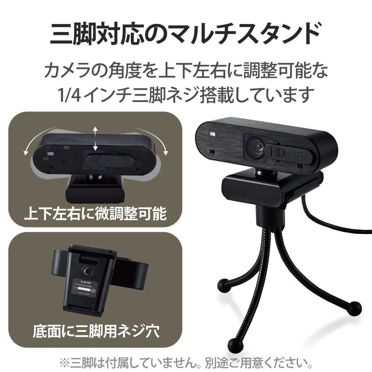 ■ マルチスタンド底面には1/4インチ三脚穴を搭載し、市販の三脚に設置して使用できます。