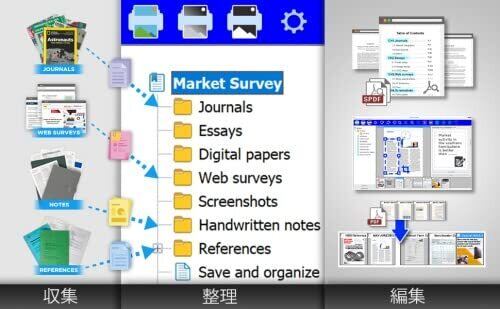 スキャン内容に基づいて自動回転・傾き補正・トリミング、複数ページの画像を1ファイルとして保存可能、PDFブックの作成が簡単