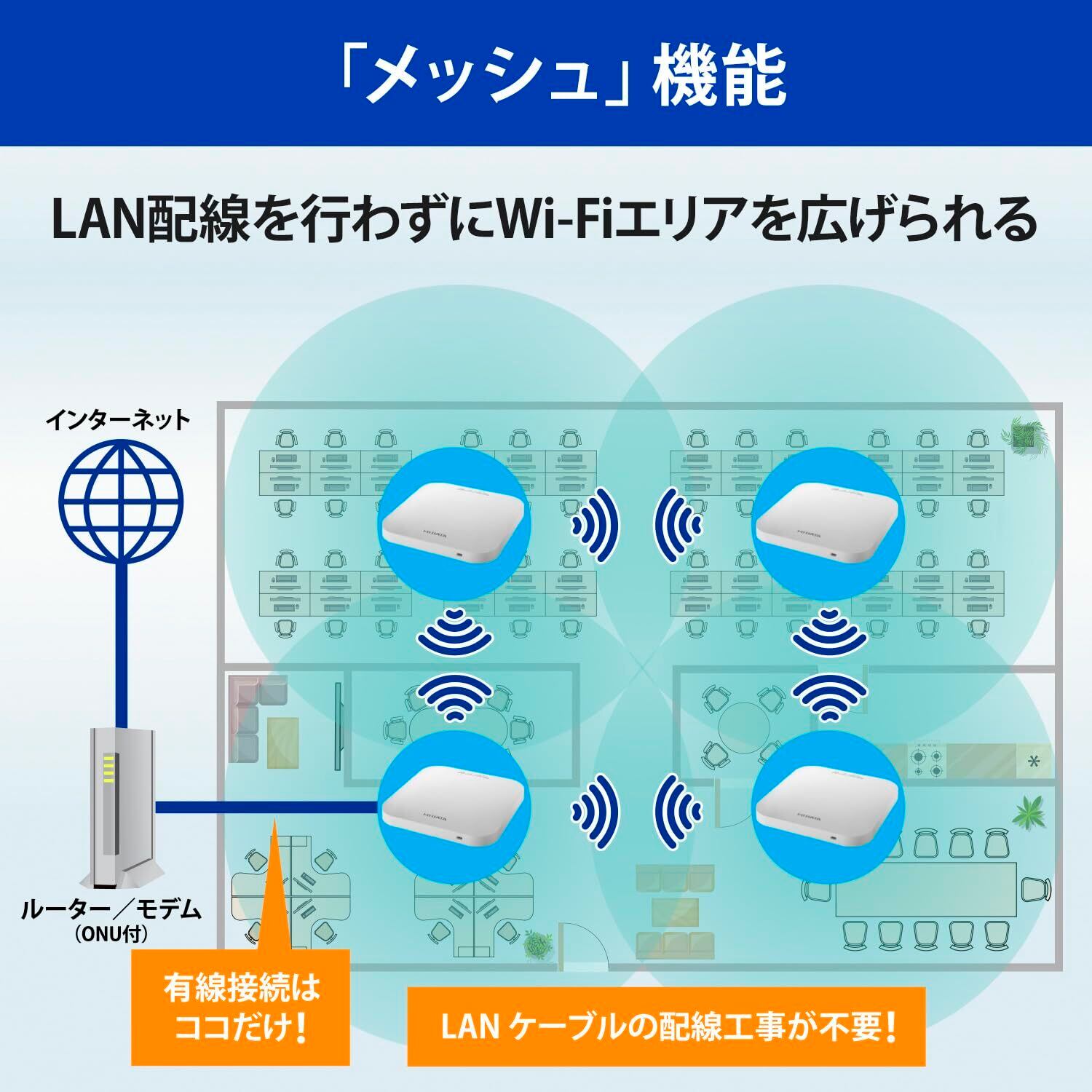 【メッシュでオフィスのWi-Fiエリアを広げる】「メッシュ」機能は、LANケーブルの配線を気にせずに、Wi-Fiエリアを拡大することができるため、電波が届く範囲で電源が確保できるところであれば、自由にアクセスポイントを増設することができます。また電波などの情報からより安定した通信が可能な経路を自動的に選択して通信経路の最適化を行うため、端末側で特に意識することなくご利用いただけます。