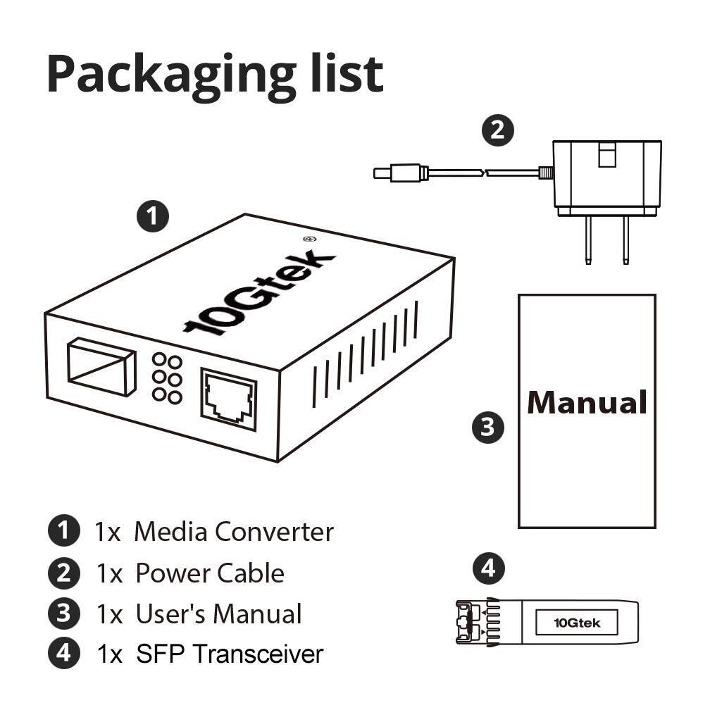 梱包内容:1*ギガビットメディアコンバータ、1*1000Base-SX SFP、1*DC電源アダプタ(5V-1A、PSE認定)、1*マニュアル。