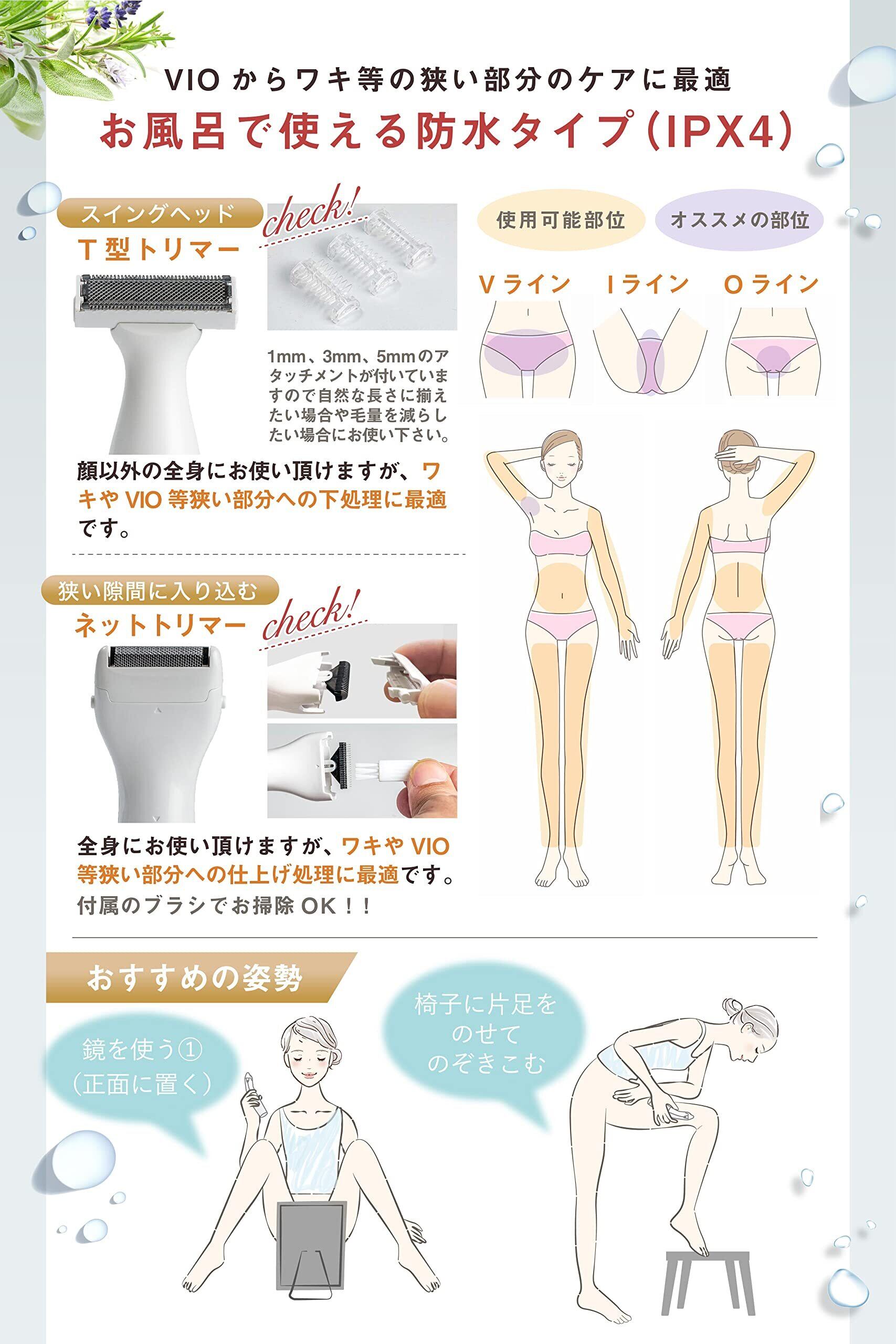【女性の要望に寄り添って改良】「デリケートゾーンをキレイに処理したい。」「脱毛サロン前にVIO処理したい。」「カミソリ処理は黒いポツポツが気になる。」そんな女性の要望に応える為、シェーバー関連の製品を取り扱う10か所以上の工場からサンプルを取り寄せ、「剃りごこち」や「使いやすさ」、「耐久性」等を一緒に試行錯誤して頂いた1社に絞って発注を行っております。また、設計段階で要望の多かった、「お風呂で使いたい」との希望にこたえる為、防水機能も採用させて頂きました!