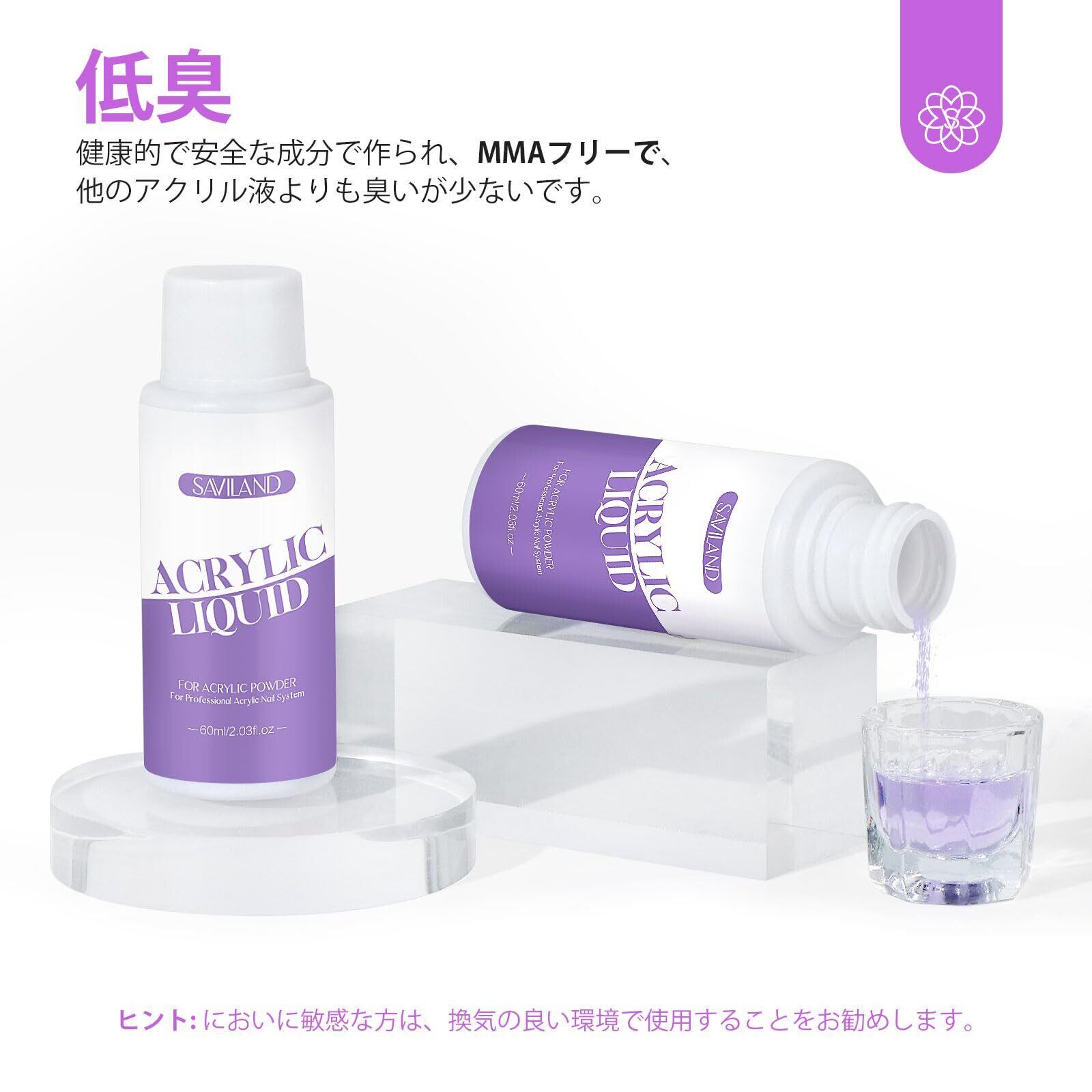 2 個のアクリルリキッドコンビネーション - Saviland アクリルリキッドセットには、アクリルパウダー用の 60ml ネイルリキッドが 2 個含まれています。 Saviland は、最新の専門的な製造技術とアップグレードされた MMA フリーのフォーミュラを採用して、クリアな色、スムーズな塗布、吸収しやすいことを保証します。アクリルネイルリキッド2個セットは、家庭でのアクリルネイルの練習やアクリルネイルブラシのメンテナンスに最適です。