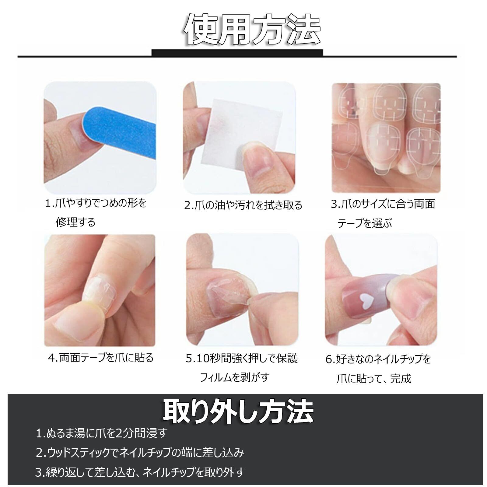 【簡単な使用方法】 爪を切って清潔にし、適切なサイズを選んでネイルテープを貼り、10秒間爪に押し付けてください。プレスオンネイルを剥がすときは、1分ほど水に浸しておくと剥がしやすくなります。