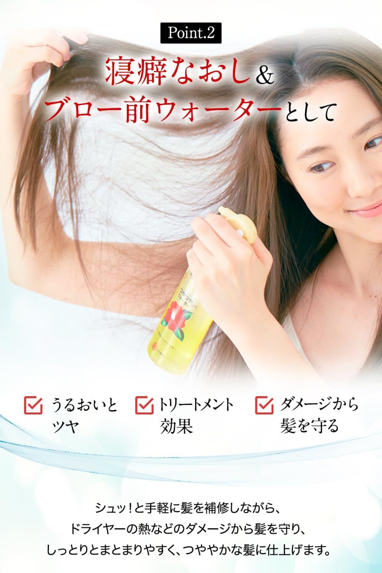 椿油・ツバキセラミド配合のヘアウォーターです。