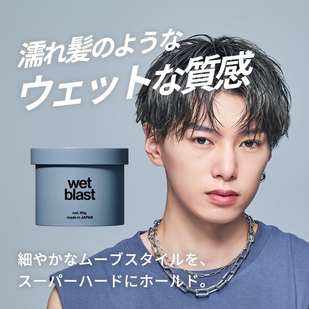 【ウェットブラスト】濡れたような質感の細かい毛束をスーパーハードなセット力で自在に動かし散らしてガッチリホールドします。