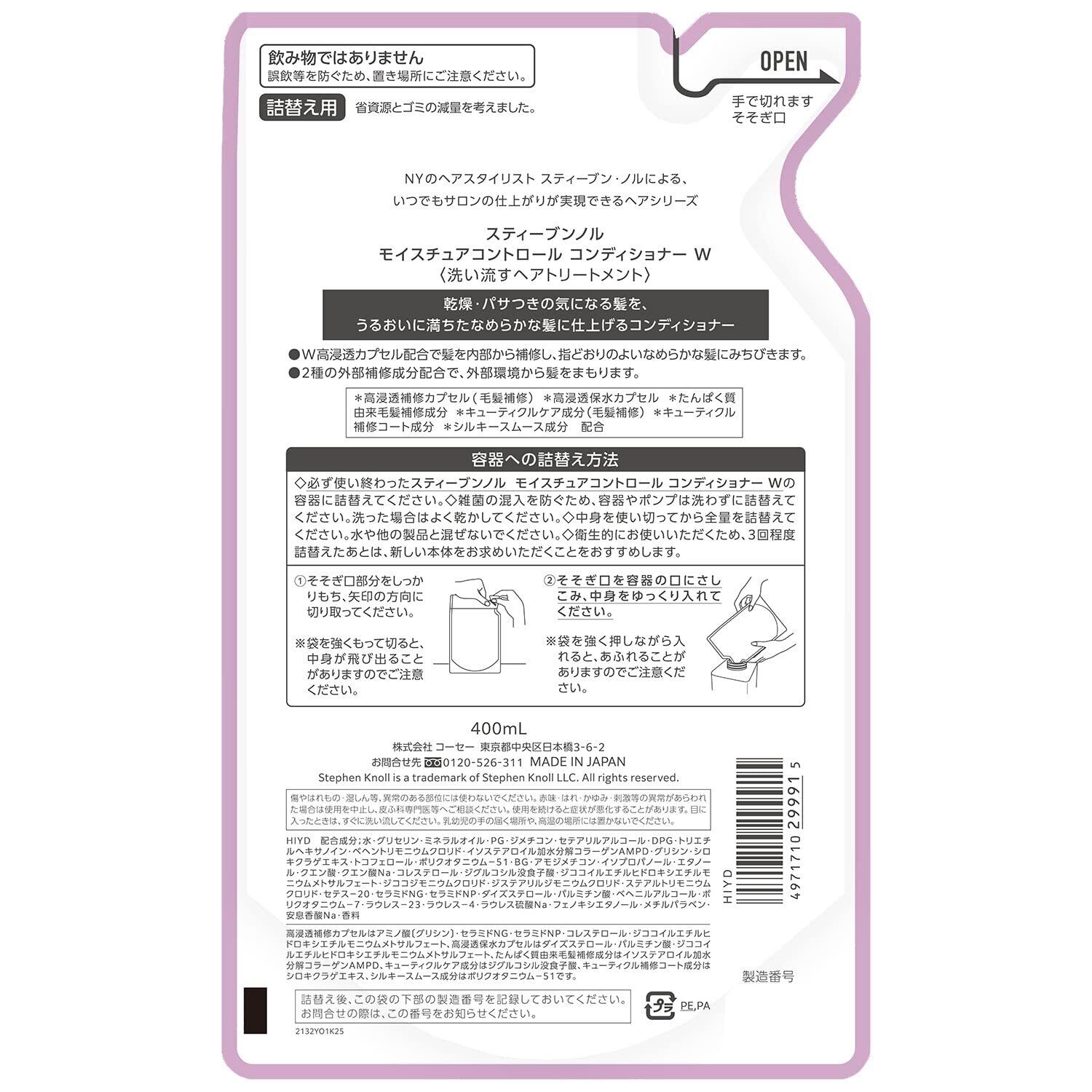 STEPHEN KNOLL(スティーブン ノル) モイスチュアコントロール コンディショナー 詰め替え 400ml うるおい補修 乾燥 パサつき アミノ酸 ノンシリコン
