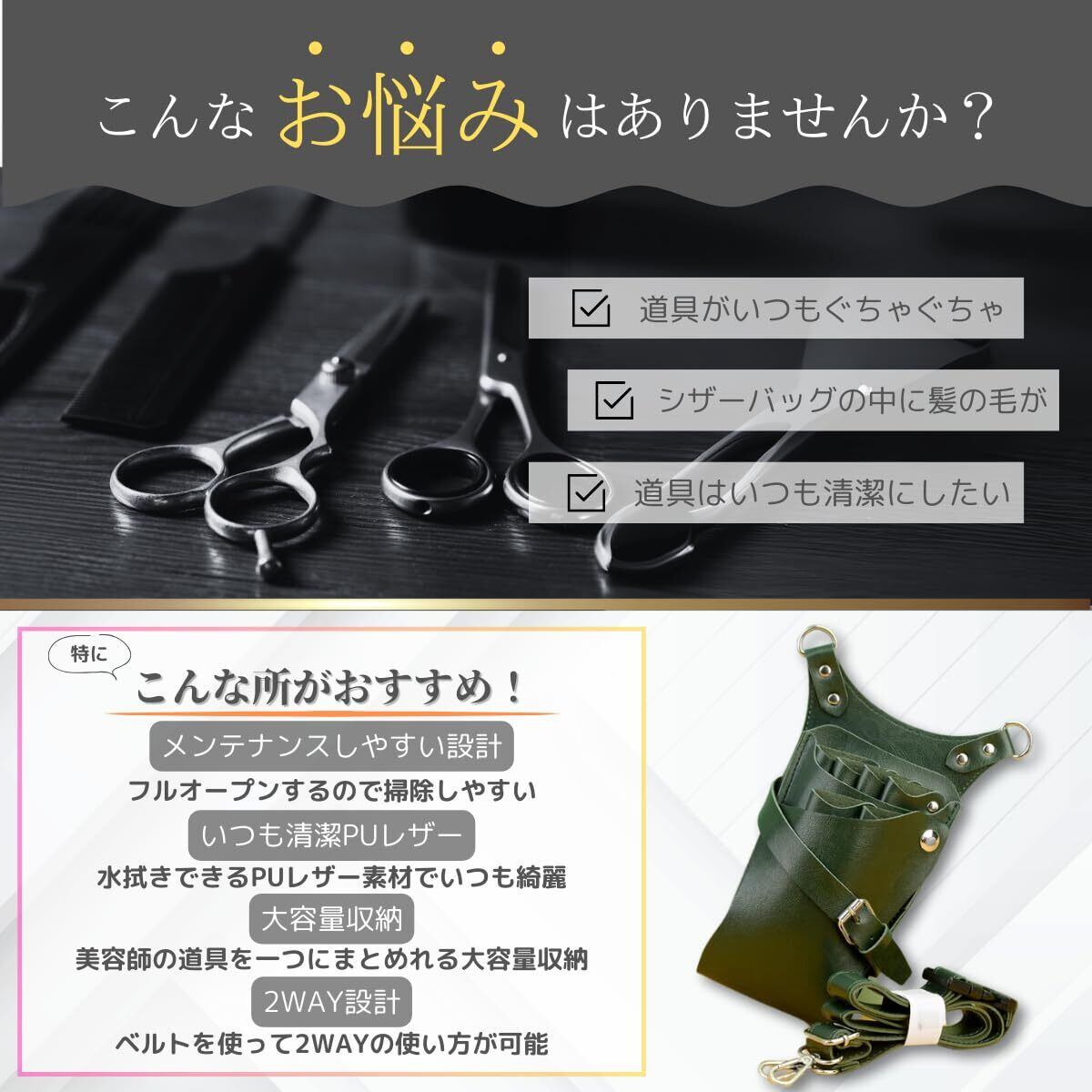 【機能】ハサミだけではなく、くしやコームも指せる多機能な収納箇所もあり、これ一つで万能使いできるデザインとなっております。便利なベルト付きで長さを調整することが出来るため、肩掛けはもちろん,腰掛けも対応できます。