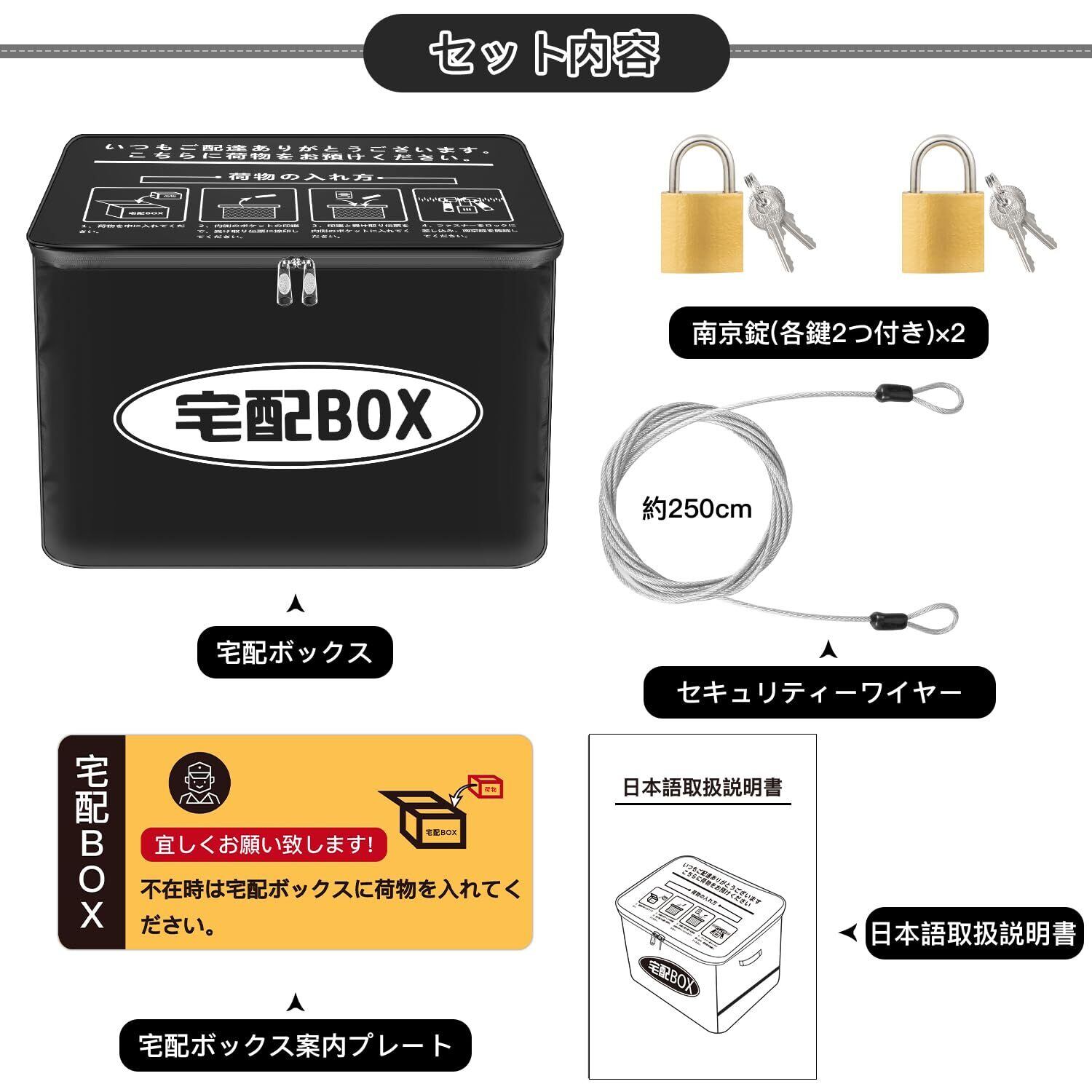 ⊿盗難防止機能を搭載:増大版南京錠と盗難防止ワイヤーが付属しており、セキュリティ面でも安心。大切な荷物をしっかりと守るための工夫が施されています。お出かけの際でも、受け取りを心配せずに出かけられます。