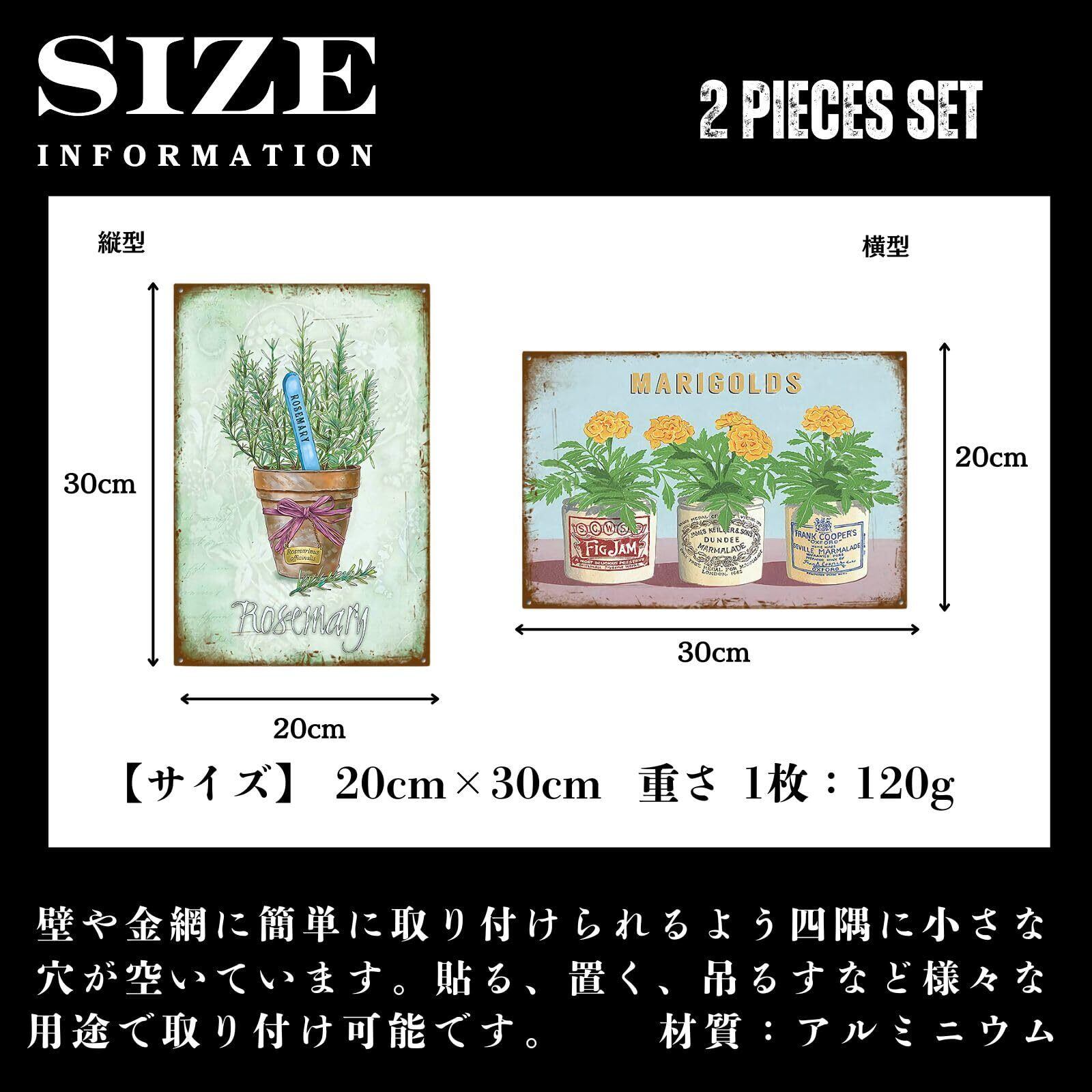 【ガーデニング空間をおしゃれに演出】植物や蝶、鳥など自然をモチーフにしたデザインが、庭やベランダに温かみと癒しをプラスします。昔のものを復刻したかのようなデザインで、古びた感がとてもおしゃれなブリキ看板です。2枚セットでさまざまな場所に飾ることができ、屋外のイメージ作りに活用してください。また、アンティークな風合いがおしゃれなアクセントになります。お家やお店のインテリアにはもちろん、プレゼントにもぴったりです。