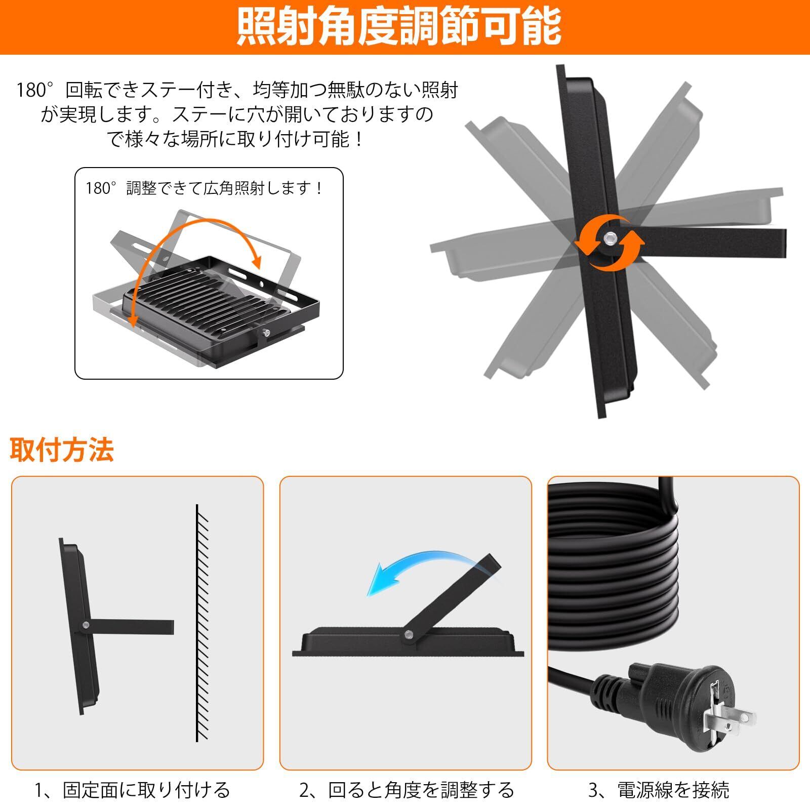 【角度調節可能&様々な場所で活躍】:発光角度は120度、光源ムラのないきれいな光のラインを実現します。角度調整可能です。ブラケットは180度回転できます、取り付ける場所が様々です。庭用、看板照明、駐車場、倉庫用、投光器として使用されます。何か問題などが御座いましたら、お手数をおかけして恐縮ですが、注文番号、質問内容を添えて【アカウントサービス】-【注文履歴】-【販売:MEIKEE-JP】-【質問する】のほうでお気軽に弊社までご連絡くださいますようお願い申し上げます。