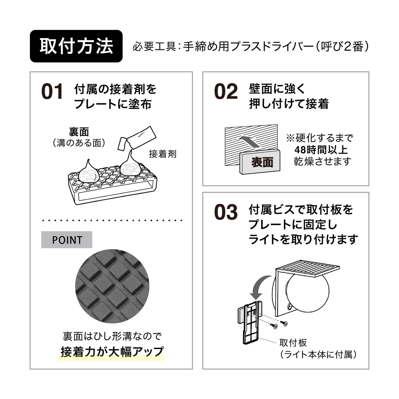 この接着プレートの最大の特長は、**穴開け不要の強力な接着固定**を実現する点です。賃貸住宅にお住まいの方や、建物の外壁に傷をつけたくないお客様に最適なソリューションを提供します。セットには、プレート本体に加え、**強力な化学反応形接着剤(変性シリコーン含有)**が付属しており、これを使用することで、ライトを安定かつ堅固に壁面に取り付けることが可能です。接着剤に加えて、より強固な設置を希望されるお客様向けに**ステンレス製のドリルビス**も付属しており、設置場所やニーズに合わせて取り付け方法を選択できる**ハイブリッド仕様**となっています。