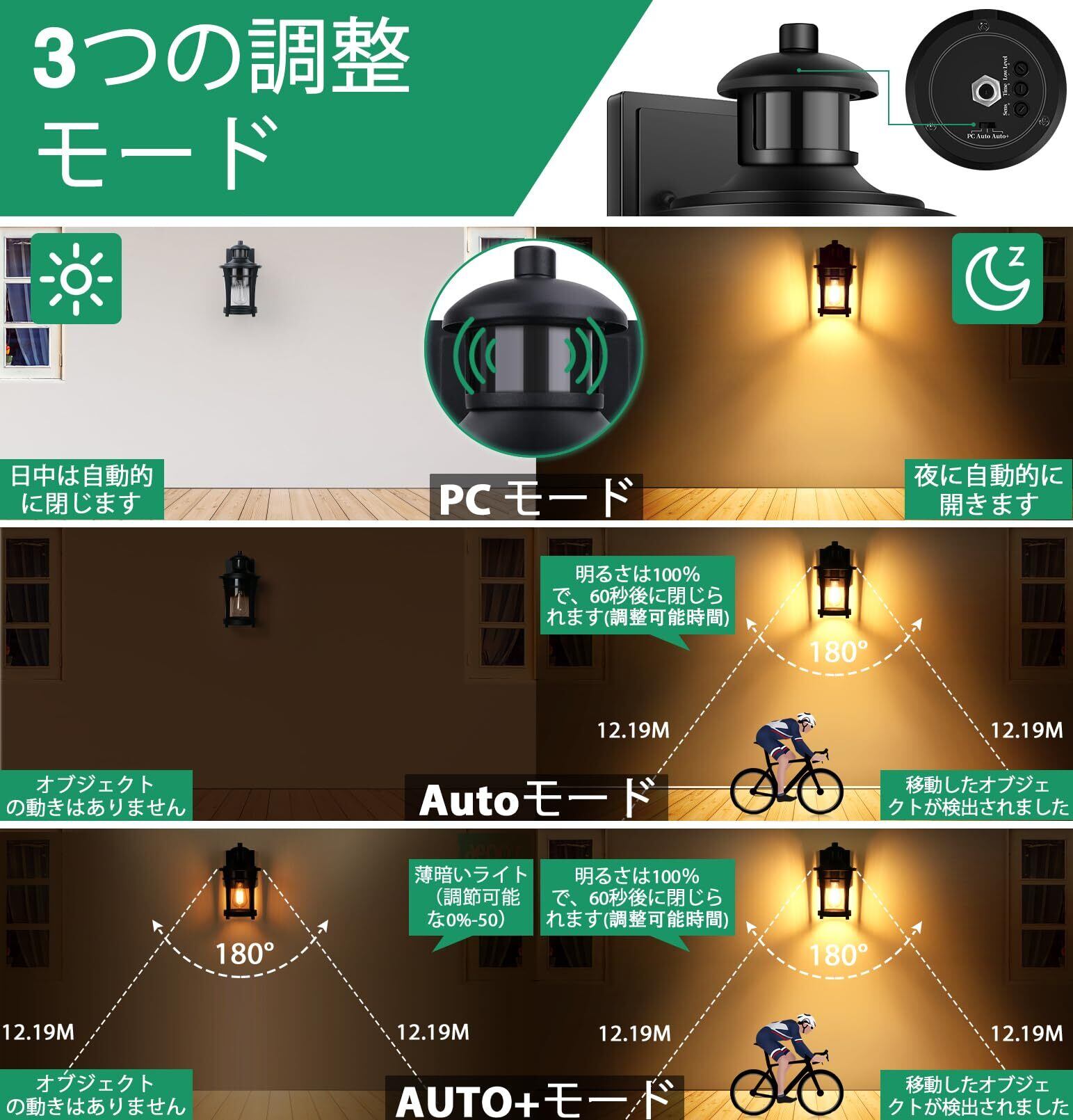 人感センサーと明暗センサーで省エネ:当社の屋外照明器具は6年以内に開発された革新的な技術で、3つの照明モード(PC、Auto、Auto+)から選択できます。モーションセンサーのセンサー距離 (0 ~ 12 メートル)、点灯時間 (20 ~ 180 秒)、および照明の明るさを 0% ~ 50% で設定できます (Auto+ モードのみ)。