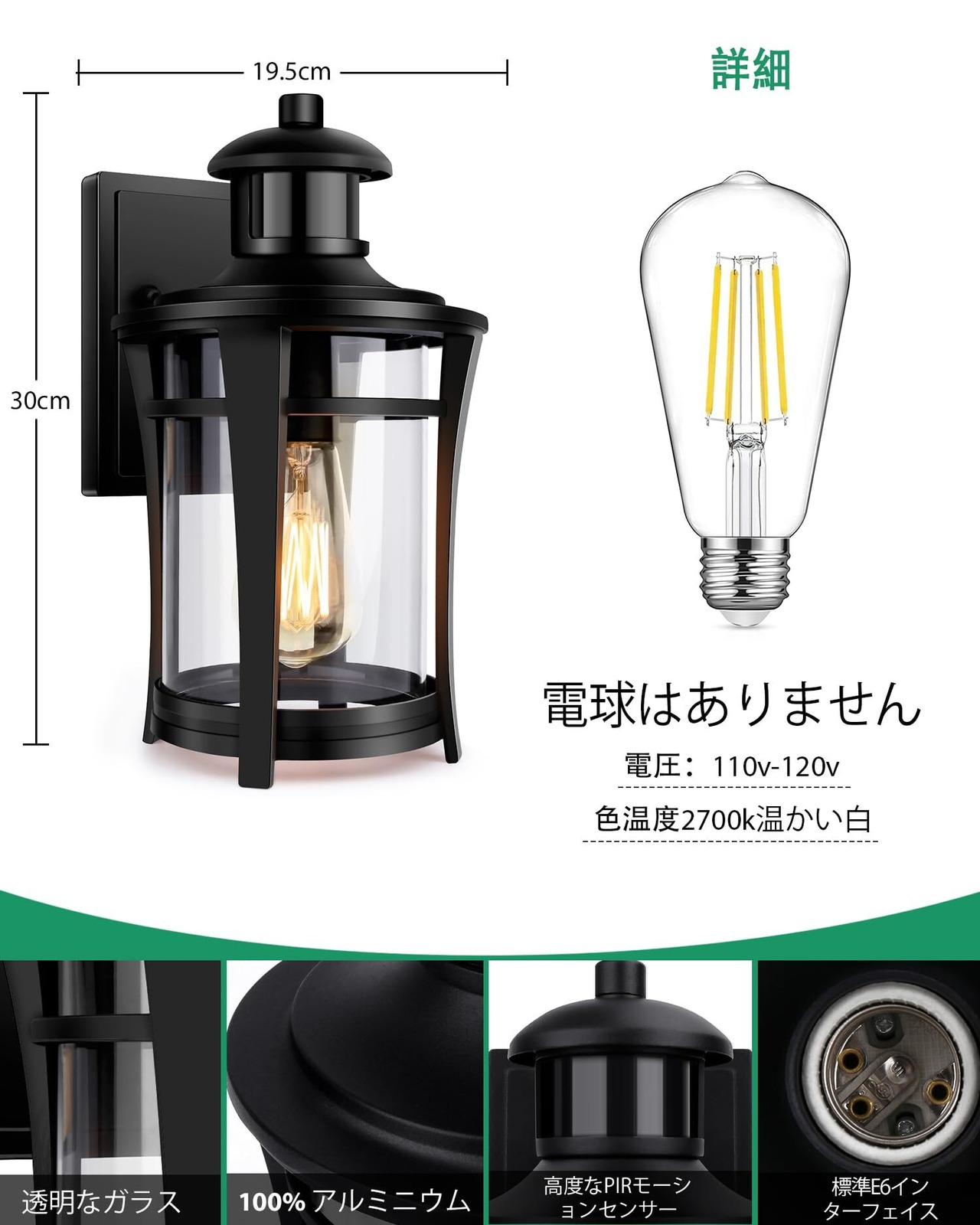 Lamomo 玄関灯 人感センサーライト 屋外照明 防水 壁掛け照明 門柱灯 口金E26電球対応(電球は含まれていません) 60w AC110V 配線必要/廊下/玄関/室外/ガレージ/ベランダーなど