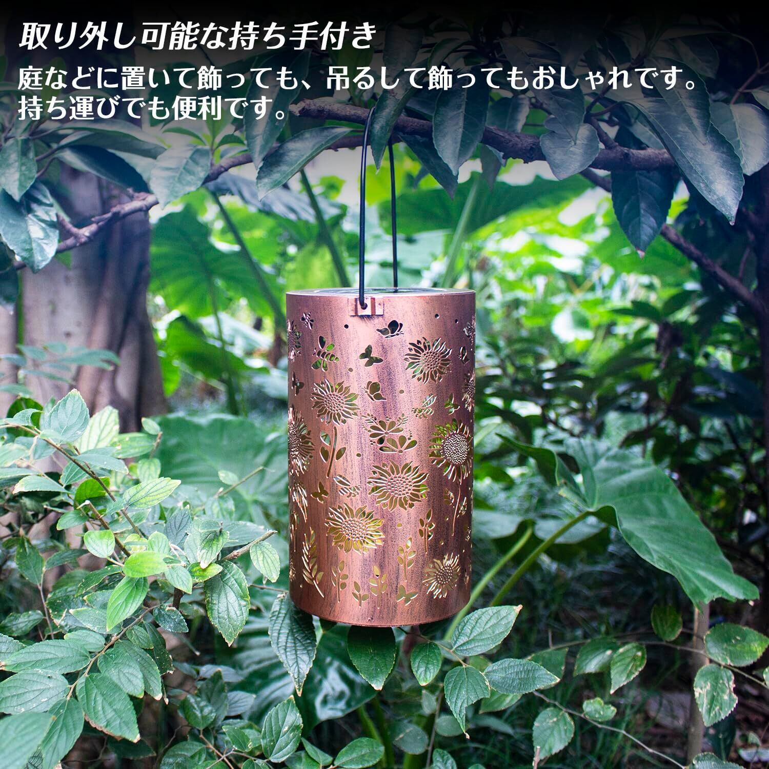 オシャレなソーラーランタン:シンプルなデザインですが、ライトを点灯すると透かし模様が美しく浮かび上がり、とても魅力的です。夜になると、可愛らしい花が咲き、幻想的な光と影を演出してくれます。