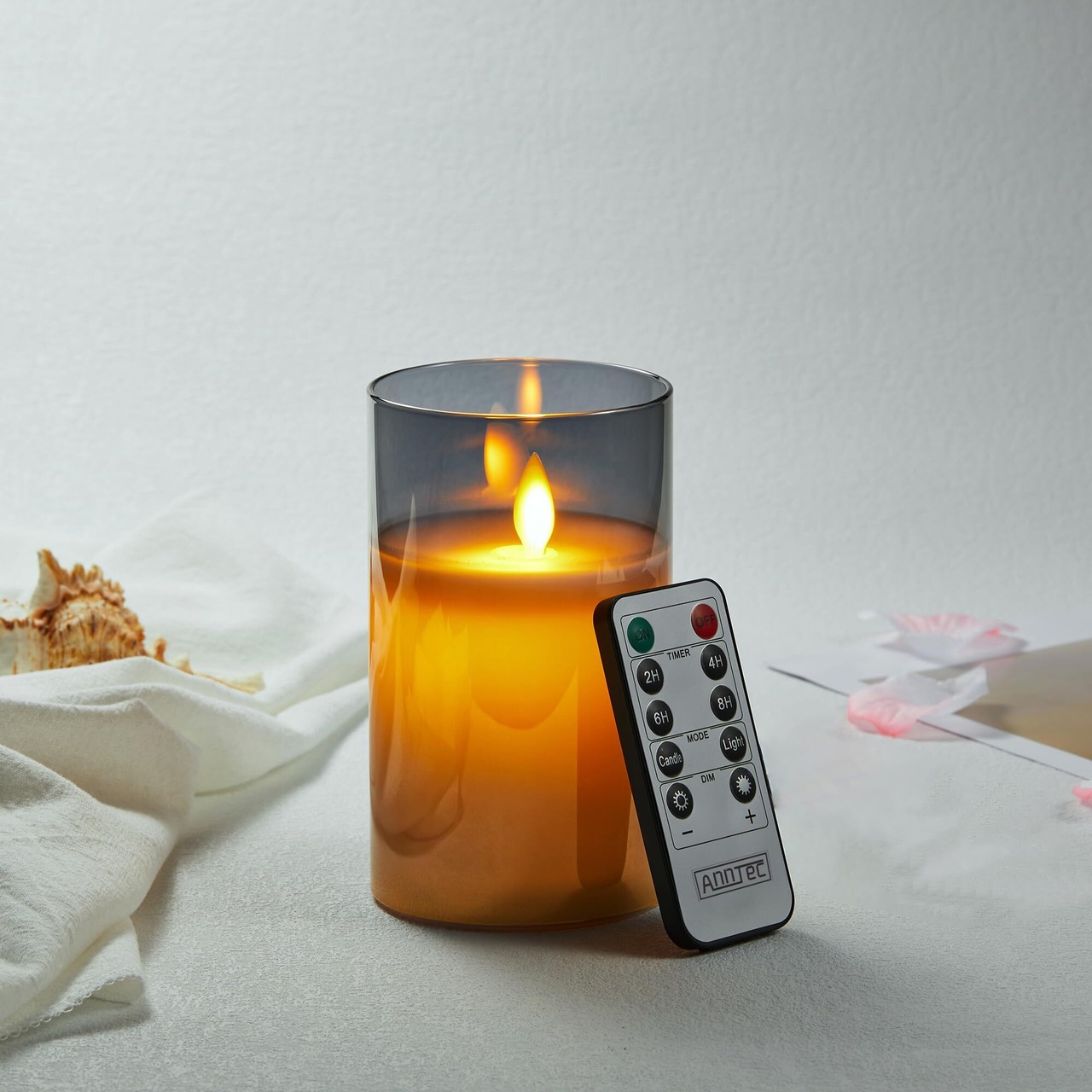 AnnTec LEDキャンドルライト ロウソク 【USB充電式】 本物の炎のようにゆらめく 暖色光 火を使わない ゆらゆら揺れる 安全 省エネ 専用リモコン付き 明るさ調整 充電式 LEDキャンドル ガラス (直径7.5cm×高さ10cm) (グレー)