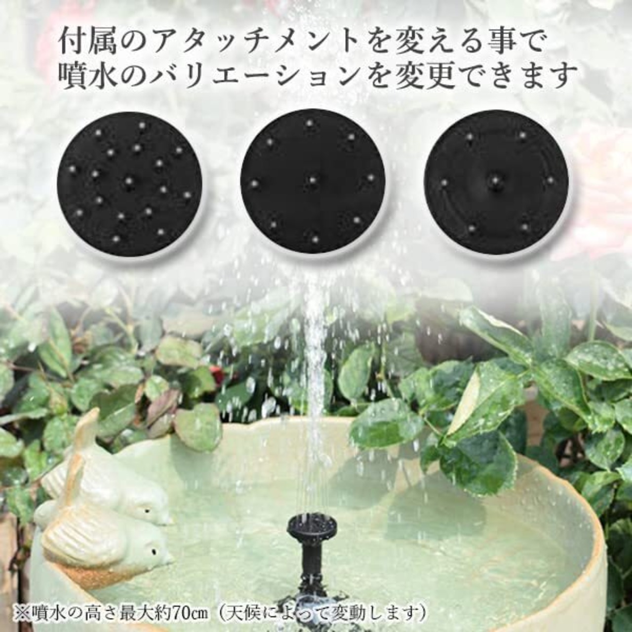 アタッチメントが付属しており、変更する事で噴水のバリエーションを変更できます。