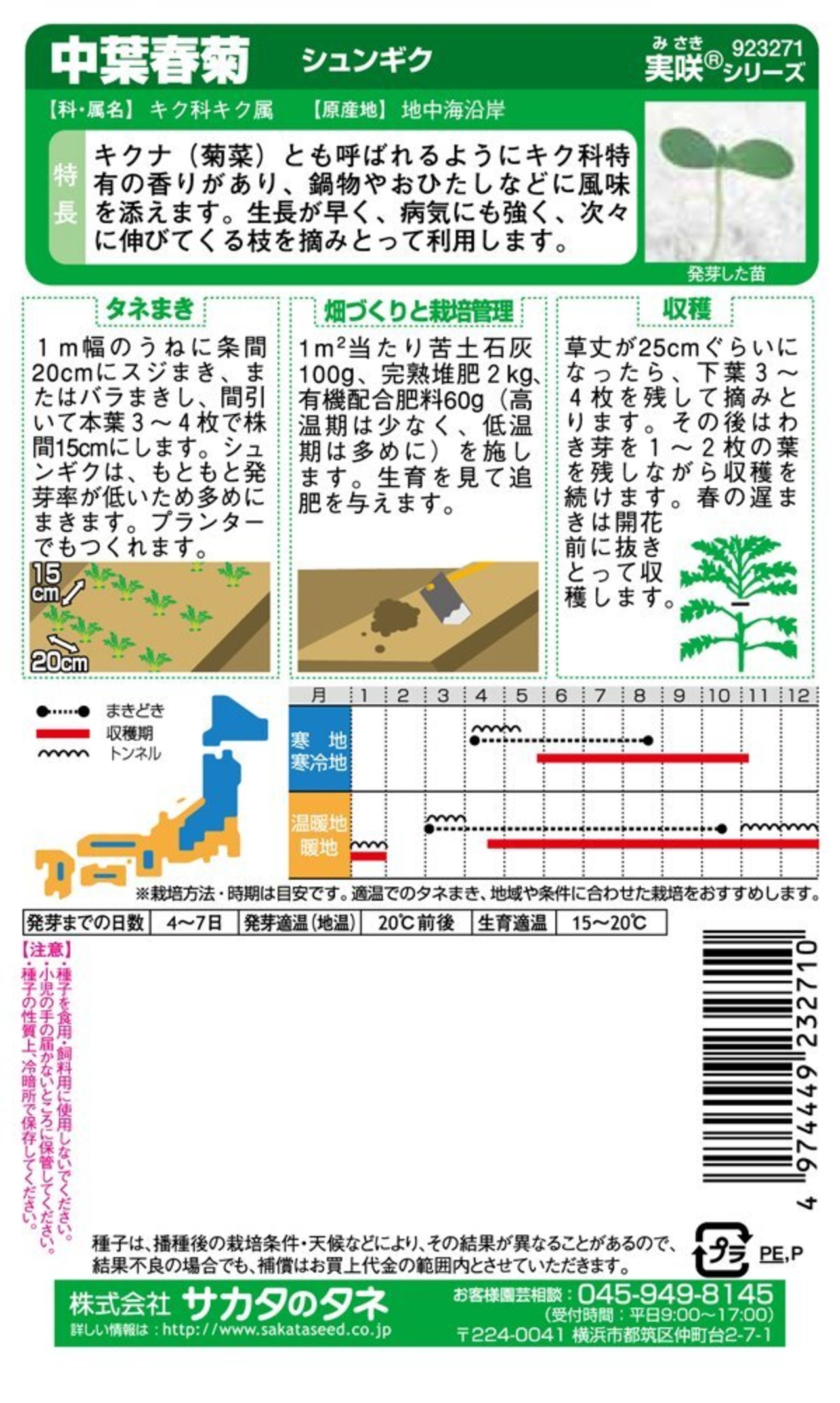 ★【安心の国内産種子!】サカタのタネの種子は、日本国内の品質管理基準に基づいて厳選されています。そのため、信頼性が高く、理想通りの健康的な春菊を育てることができる品質の一品です。万一のトラブル時も、充実したサポートがありますので、安心してご利用いただけます。