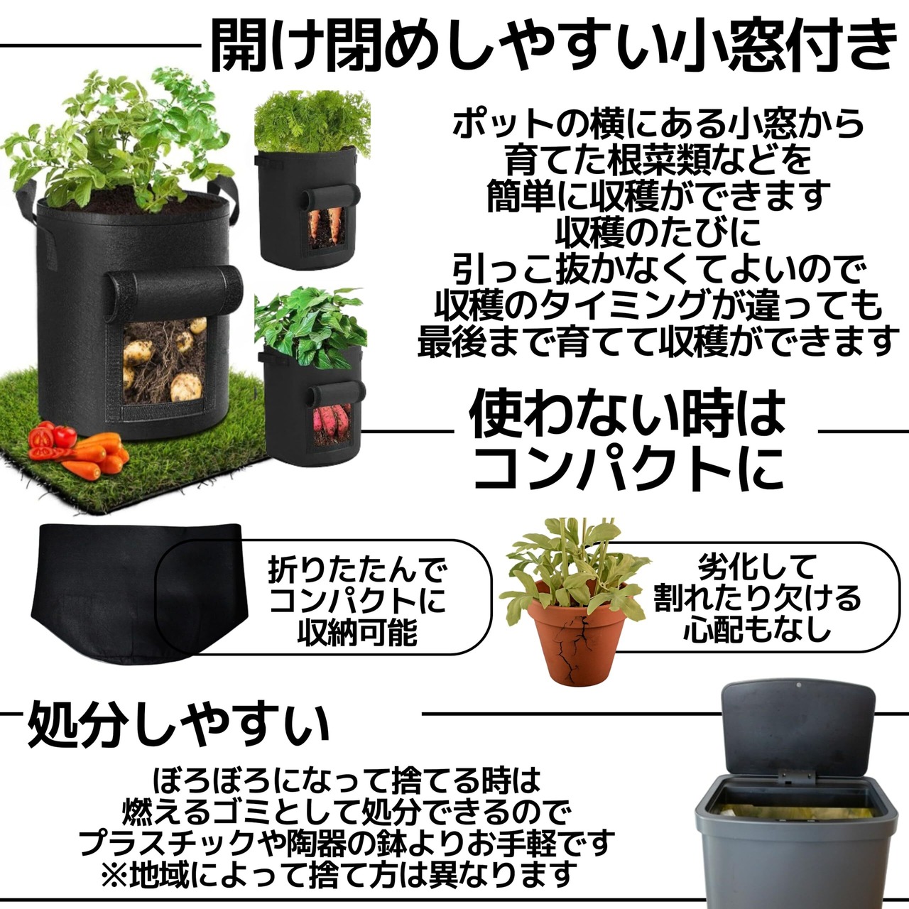 【開け閉めしやすい小窓付き】ポットの横にある小窓から育てた根菜類などを簡単に収穫ができます。収穫のたびに引っこ抜かなくてよいので、収穫のタイミングが違っても最後まで育てて収穫ができます。