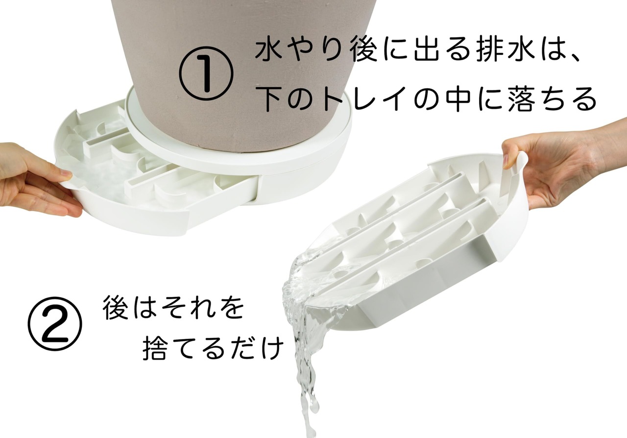 【ポットキーパーの特徴】 1.トレイから水が飛び出しづらい特殊なデザイン。トレイには水の流れを逆流させ、前に水が飛び出しづらくなるデザインが備わっています。水を捨てる際も波が立ちづらくなります。 2.本体内部でも少量の水を受けるための一体型設計。トレイ(受け皿)がないときでも、少量の水を本体内部で受けれるので、床に水がこぼれづらくなります。 3.重い鉢でも大丈夫。耐荷重は安心して使えるよう構造と素材はしっかりデザインしています。 4.許水量は1.2リットル。本体にキャスターをつけると水を受けれるトレイが小さくなるため、水をできるだけ多く受けることを重視したデザイン。移動させる場合、キャスター付きテーブル(別売)などをご利用ください。