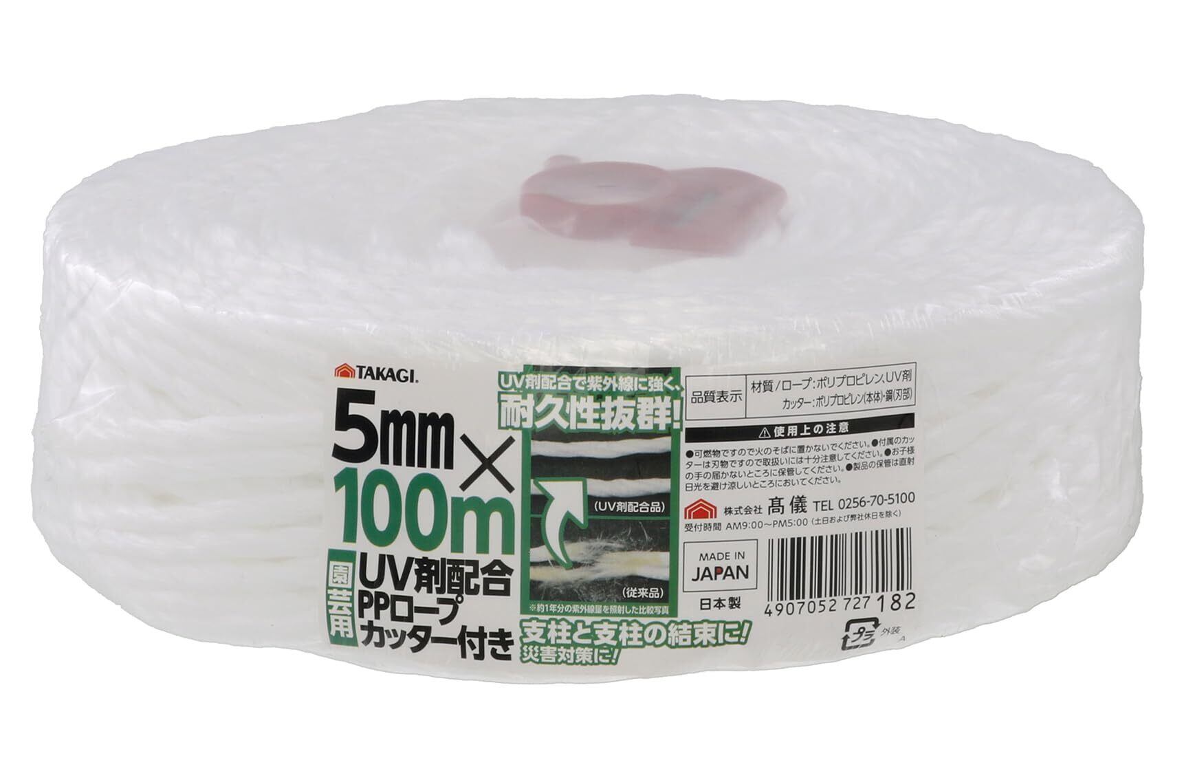 髙儀(Takagi) 園芸用 UV剤配合 PPロープ カッター付 5mm×100m 日本製 支柱 結束 災害対策 紫外線 強い 耐久性 紐 白 ポリプロピレン