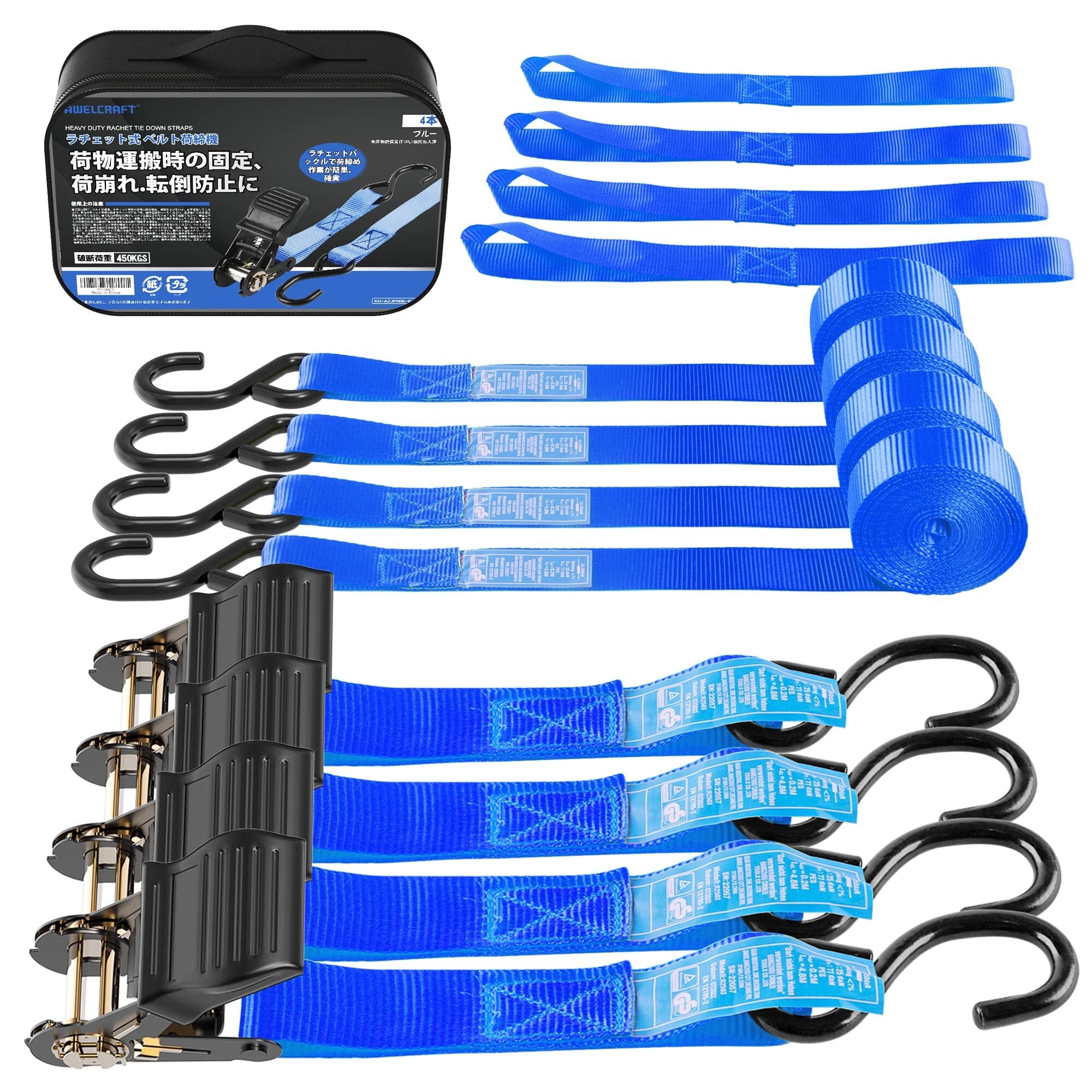 【特価セール】ラチェット式タイダウンベルト 4.5Mx4本 GS認証取得済み 破断荷重450KG 荷締めベルト 幅25mm ラッシングベルト 荷締機 固定ベルト 固定バンド 締付固定 多用途 引越し 運搬用 ブルー | KURASHILABO
