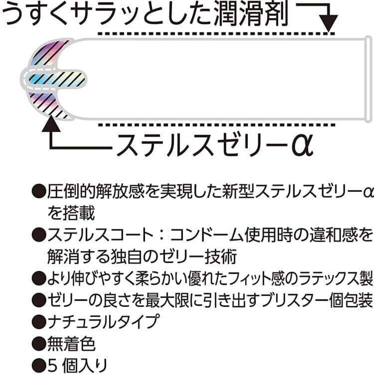 ステルスゼリーがついに誕生。 ラテックス製コンドームとゼリーの厚み、密着性が格段にアップした新処方ゼリーにより極限の一体感が生まれます。 圧倒的解放感を実現したプレミアムタイプ! 男性にも女性にもおすすめ!伸びやすく柔らかい優れたフィット感のラテックス製 コンドームの概念を覆す!? 着けないより着けた方が気持ち良い! ご注意(免責)>必ずお読みください コンドームの使用は、一個につき一回限りです。 その都度、新しいコンドームをご使用ください。 この製品は、取扱説明書を必ず読んでからご使用ください。 コンドームの適正な使用は、避妊に効果があり、エイズを含む多くの性感染症に感染する危険を減少しますが、100%の効果を保証するものではありません。