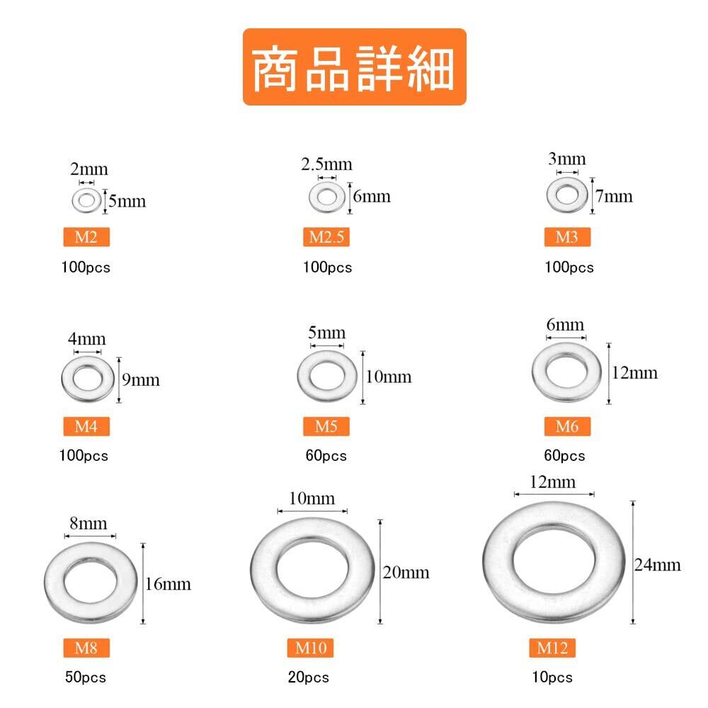 【新春セール】平ワッシャー 600個セット 9サイズ M2 M2.5 M3 M4 M5 M6 M8 M10 M12 平座金 ステンレス製 耐久性 防錆性 工業作業に欠かせない 専用ツール 収納ケース付き
