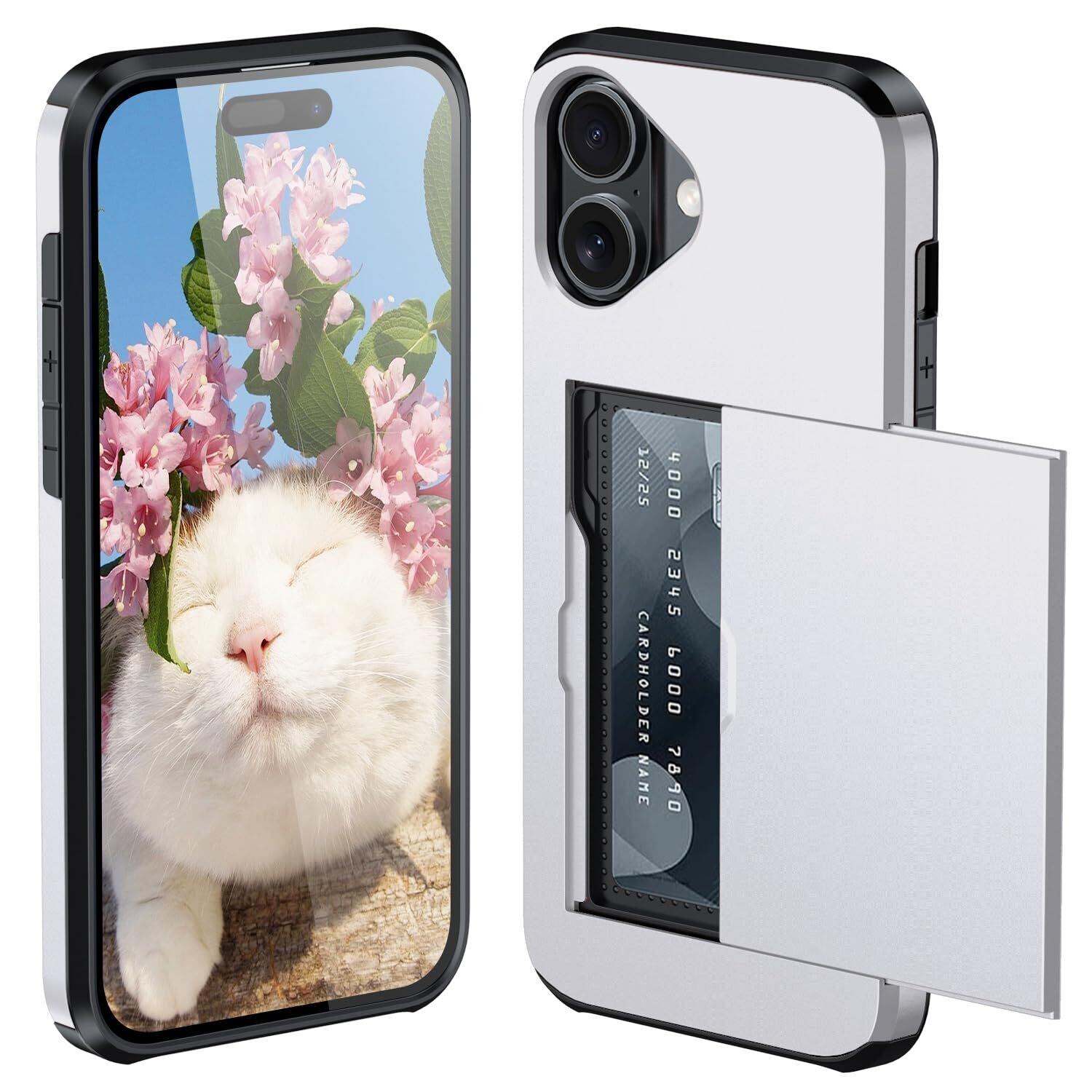 【在庫セール】対応 iPhone 16 用 ケース カード収納 背面 米軍MIL規格 耐衝撃 アイフォン16 ケース ICカード収納 落下防止 全面保護 指紋防止 滑り止め 擦り傷防止 シルバー