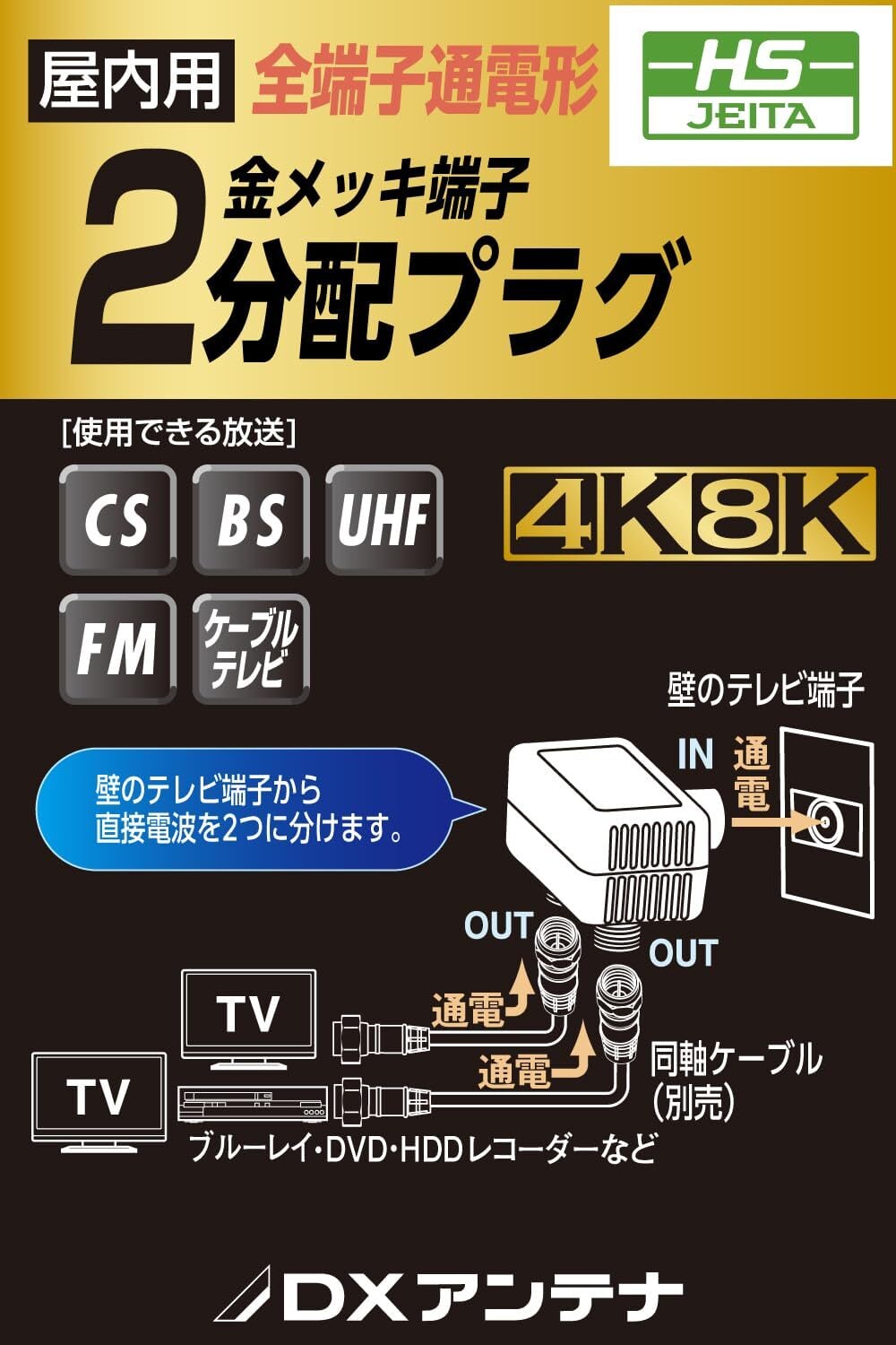 【特価セール】DXアンテナ 分配器 アンテナ分配器 2分配 地デジ・BS/CS放送対応 【2K 4K 8K(3224MHz)対応】 全端子通電形 テレビ・レコーダー増設 EC-2D1WH(H)