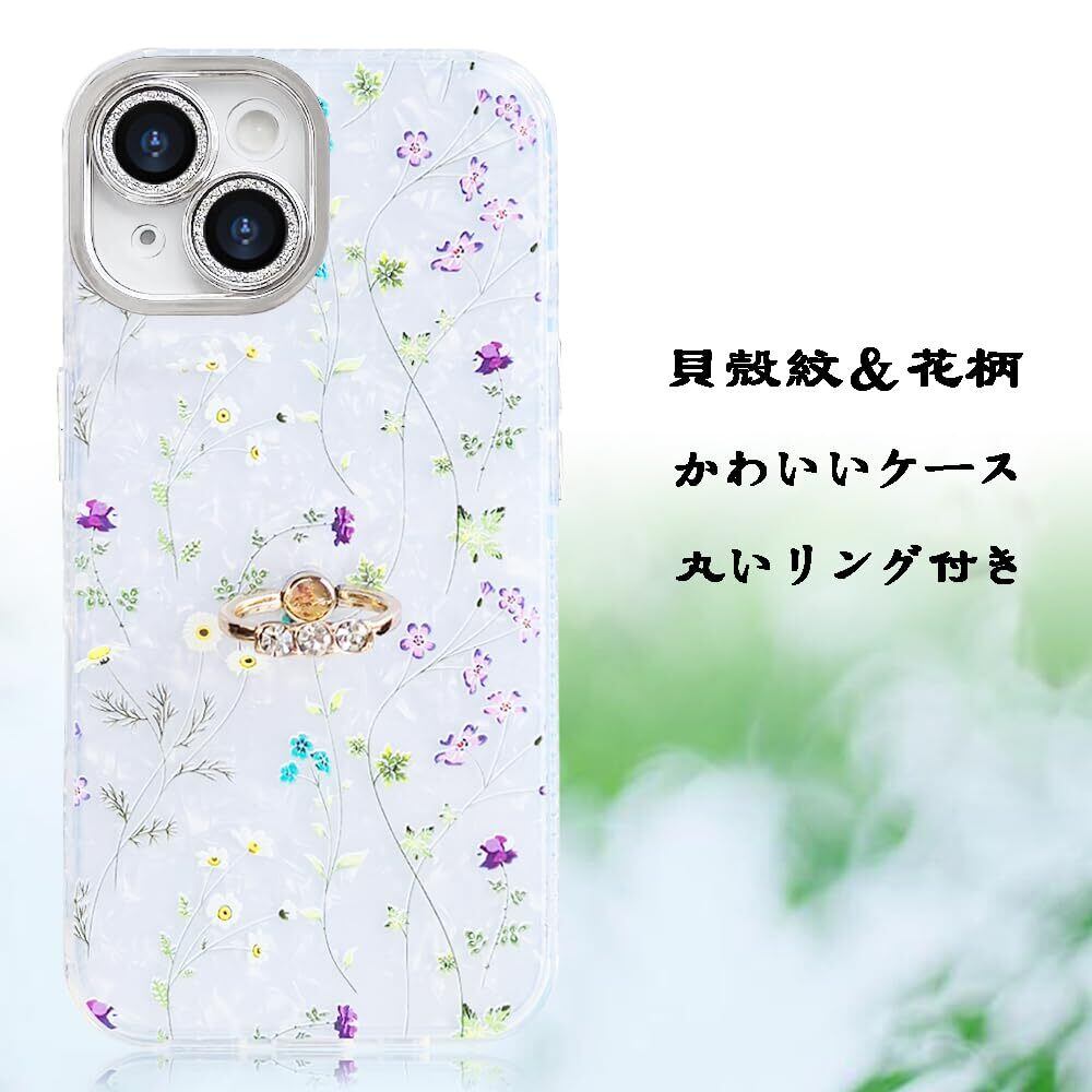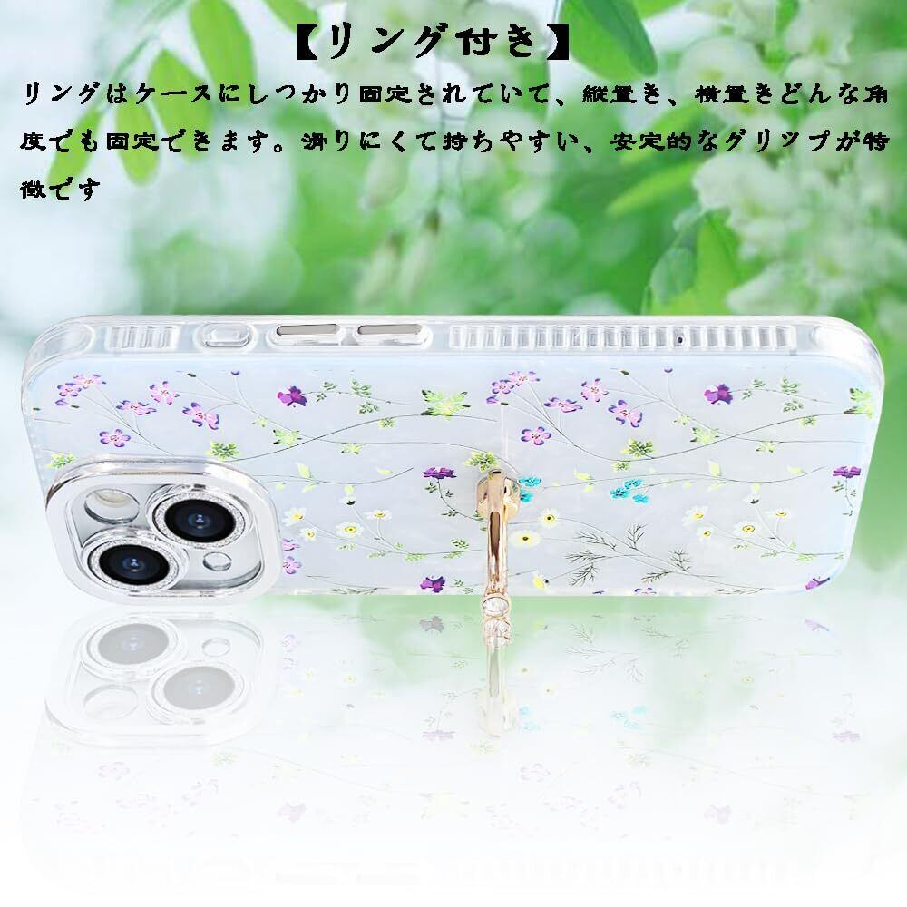 【2022最新】iPhone13 用 ケース リング付き キラキラ レンズフィルム付き カメラ保護 かわいい 花柄 キャラクター ストラップホール おしゃれ 女性人気 耐衝撃 スマホケース アイフォン13 6.1" 携帯カバー (花柄2, iPhone 13)