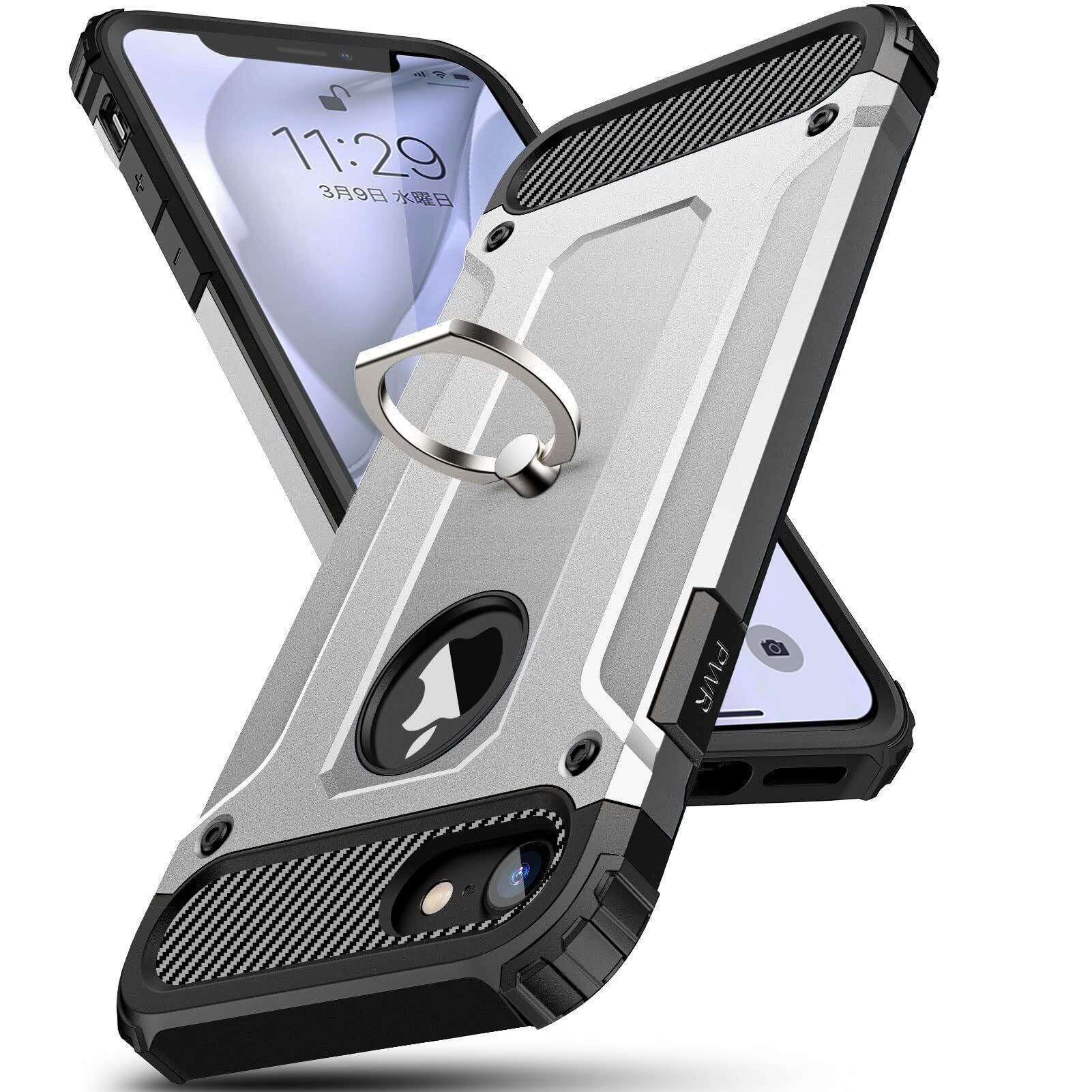 【在庫セール】iPhone7 ケース リング付き 耐衝撃スマホカバー 全面保護 米軍MIL規格 PC スタンド機能 TPUバンパー 車載ホルダー対応 レンズ保護 衝撃防止 薄型 アイフォン7 ケース おしゃれ 軽量 黄変防止 滑り防止 おしゃれ 人気 携帯カバー 銀 SJ71.16