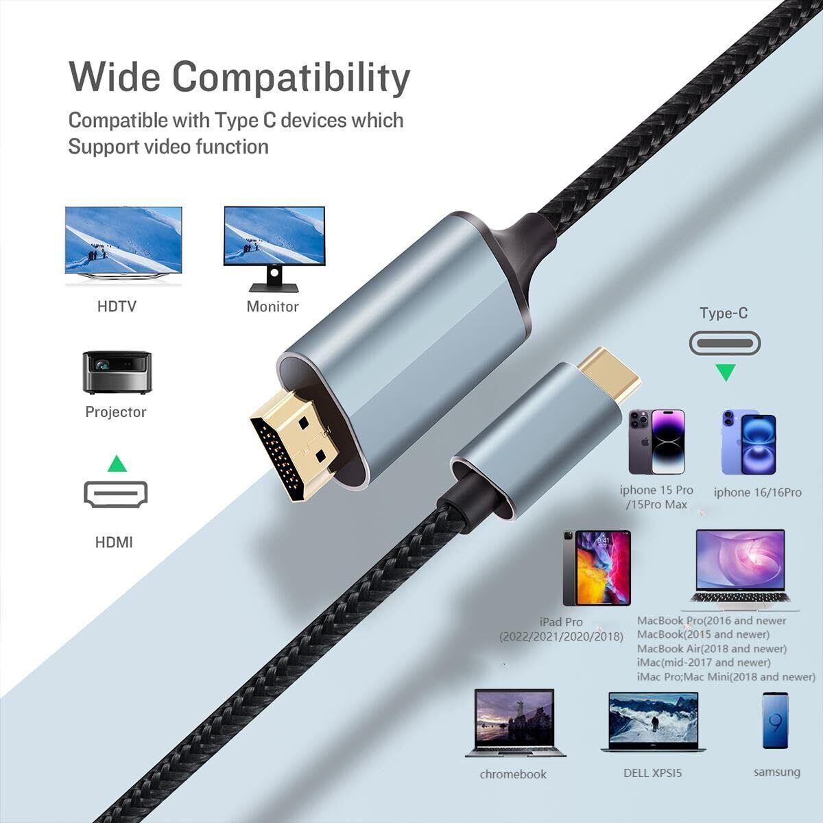 USB C HDMI 変換 ケーブル4K Type C HDMI アダプタ, Thunderbolt 3 USB C to アダプター 1M, i-phone15/16/iPad Pro/Surface Go/MacBook &MacBook Pro&Air/Galaxy(S8/S9/S10)/P30/P20/ HTC U11などに対応