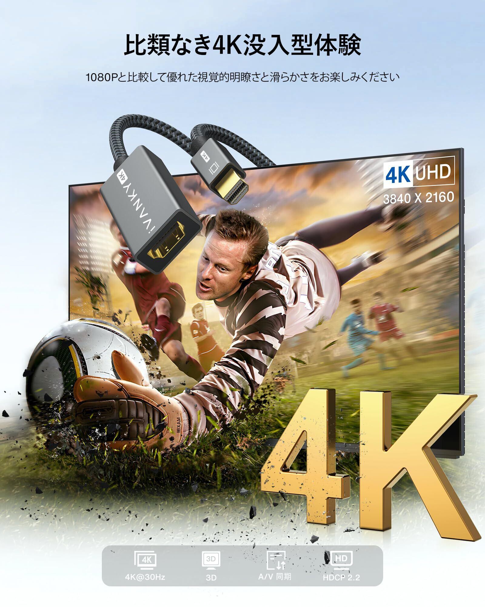 【4K UHD対応-Mini DisplayPort-HDMI 変換アダプタ】Mini DisplayPort(Mini DP) または Thunderbolt 2 ポート搭載のノートパソコンを、HDMI対応のテレビ、モニター、プロジェクターに接続し、最大4K UHD 3840x2160@30Hzの高解像度を実現。1080p@60Hzにも対応し、鮮明な映像と音声を同期出力。ステレオ3DやAMD Eyefinity技術にも対応し、マルチディスプレイ環境をサポート。