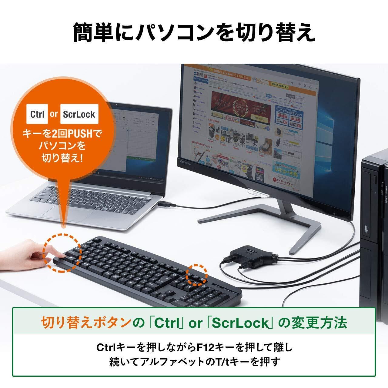 キーボードの「Ctrl」キー(または「Scr Lock」キー)を2回押すだけで、瞬時にもう片方のパソコンへ切り替えることができる、簡単操作です。
