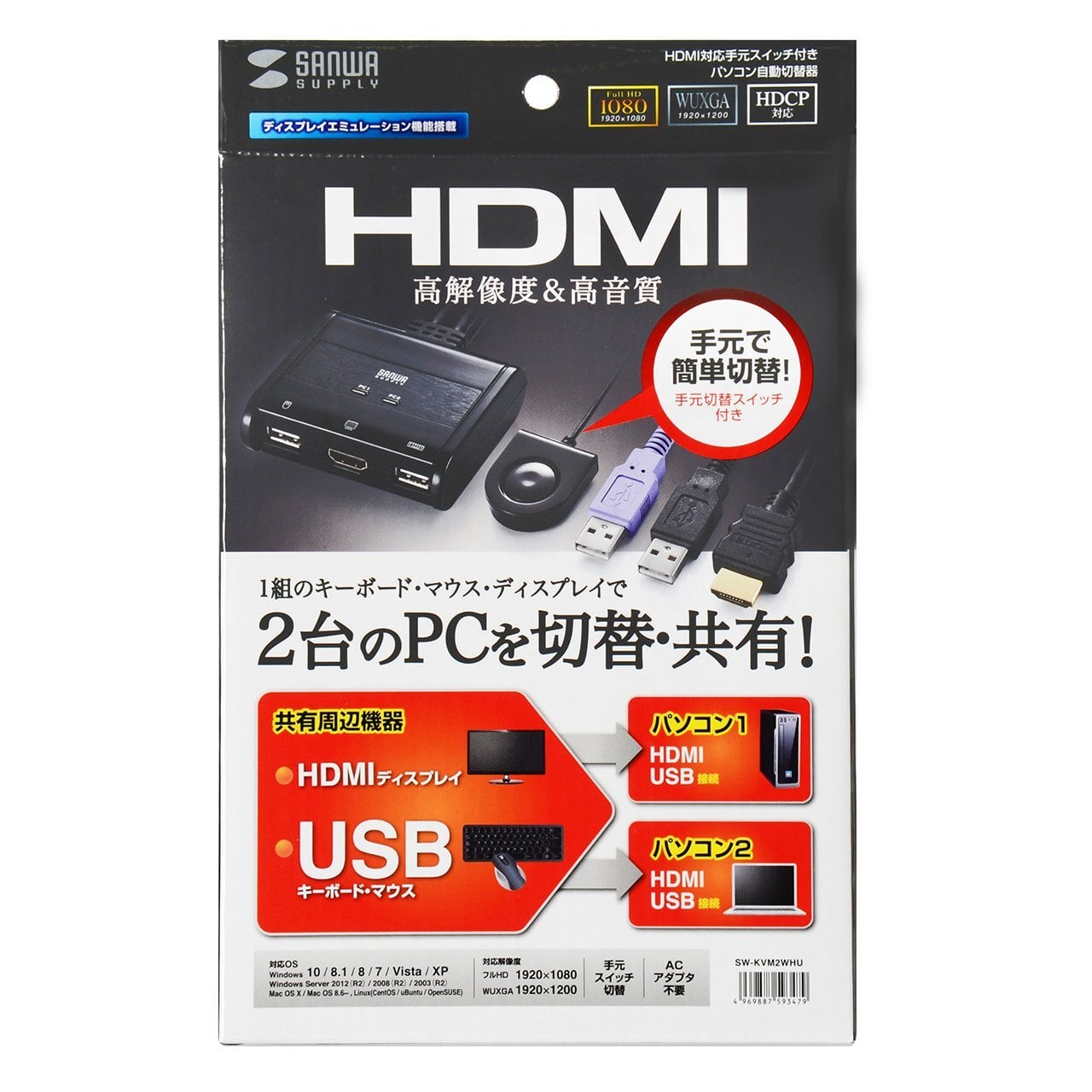 【新春セール】サンワサプライ(Sanwa Supply) HDMI対応手元スイッチ付きパソコン自動切替器(2:1) SW-KVM2WHU | KURASHILABO