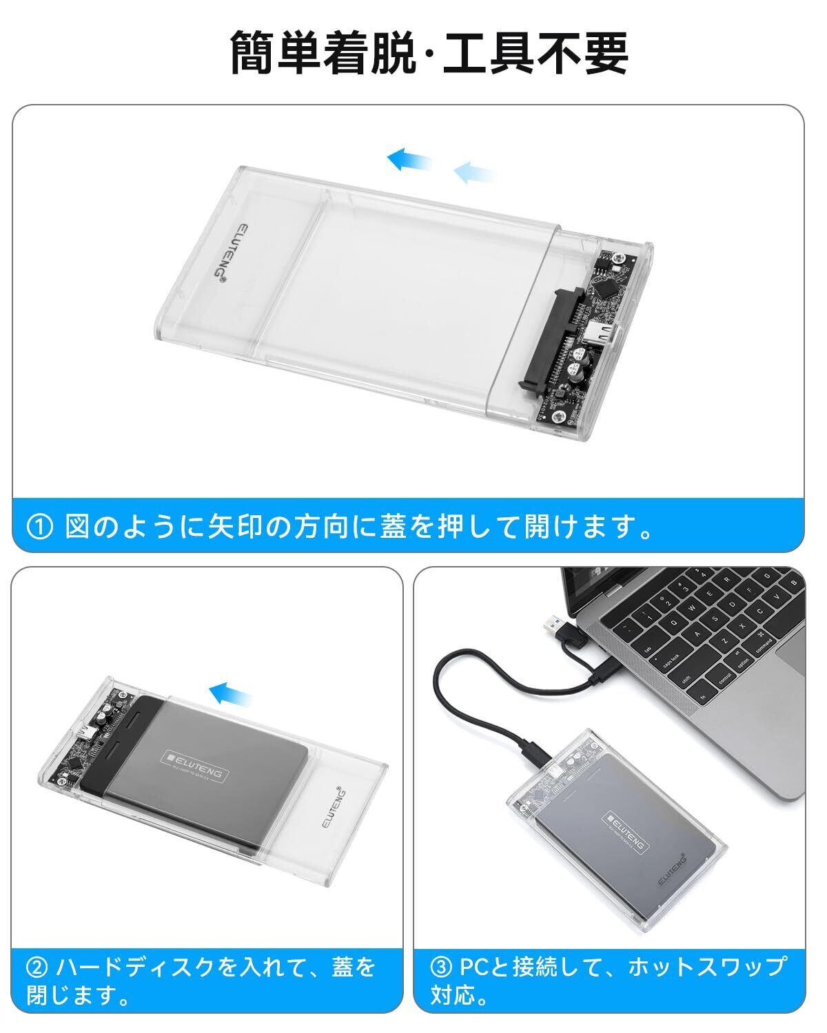 【2022最新】ELUTENG 2.5インチ HDD ケース USB3.1 GEN1 HDD/SSD ケース Type-C 6Gbps SATA III 外付けハードディスク 透明 ドライブケース 高速データ転送 UASP対応 SSD ドライブ ケース 120GB 128GB 240GB 256GB 500GB 512GB 1TB 2TB など対応(9.5mm以下)